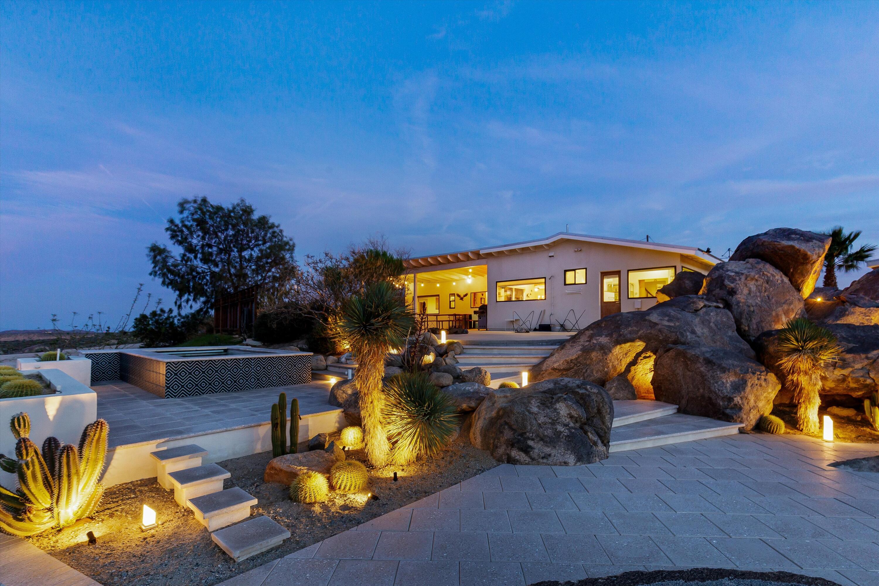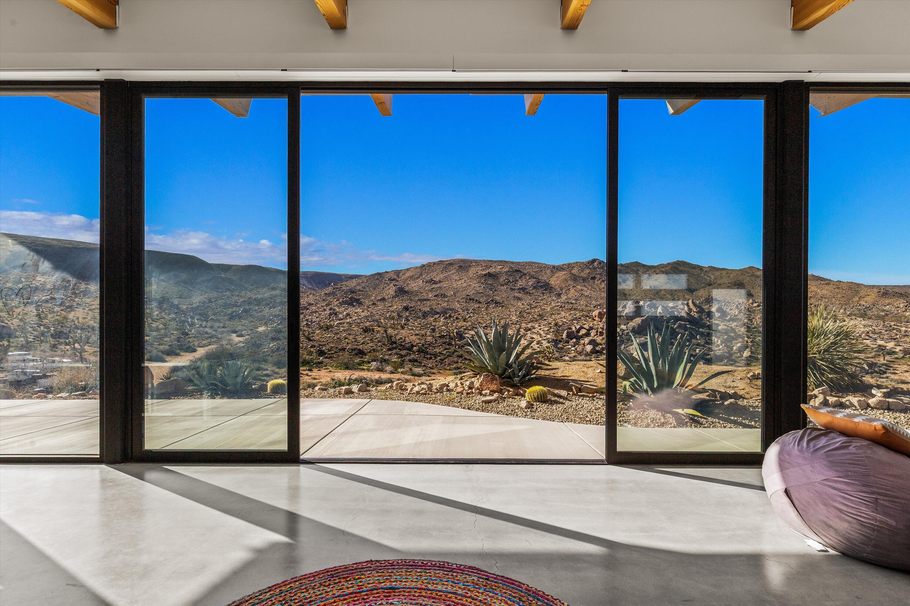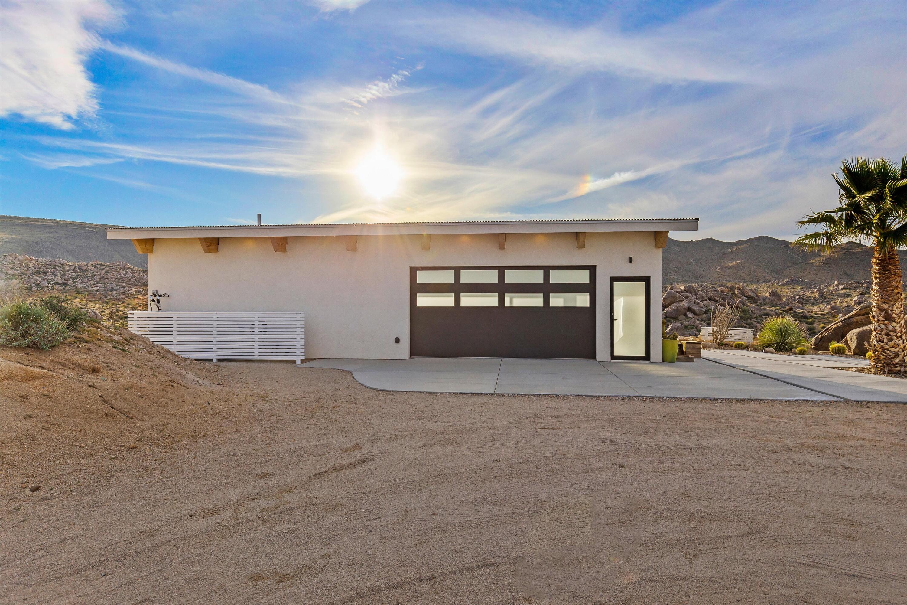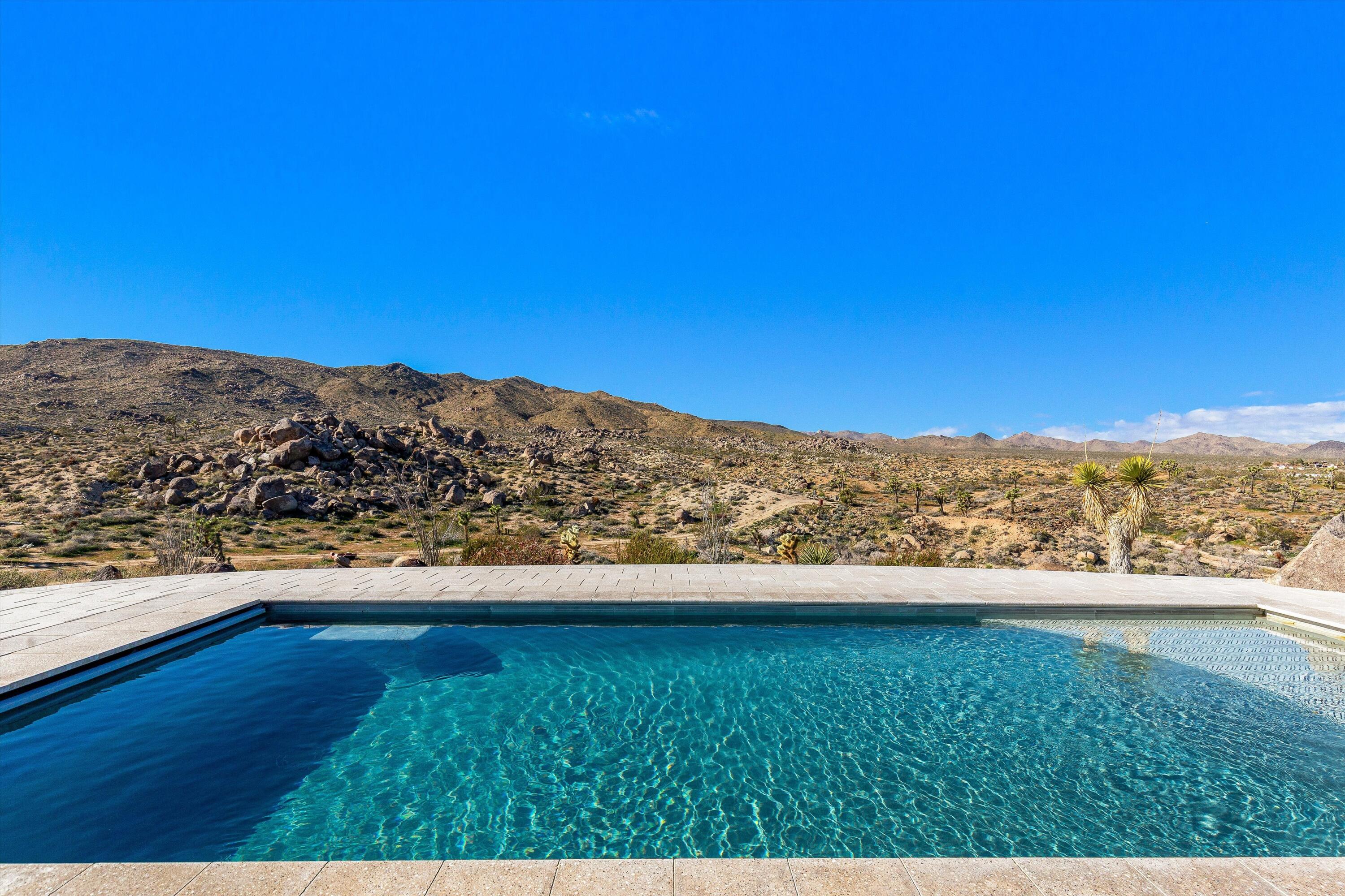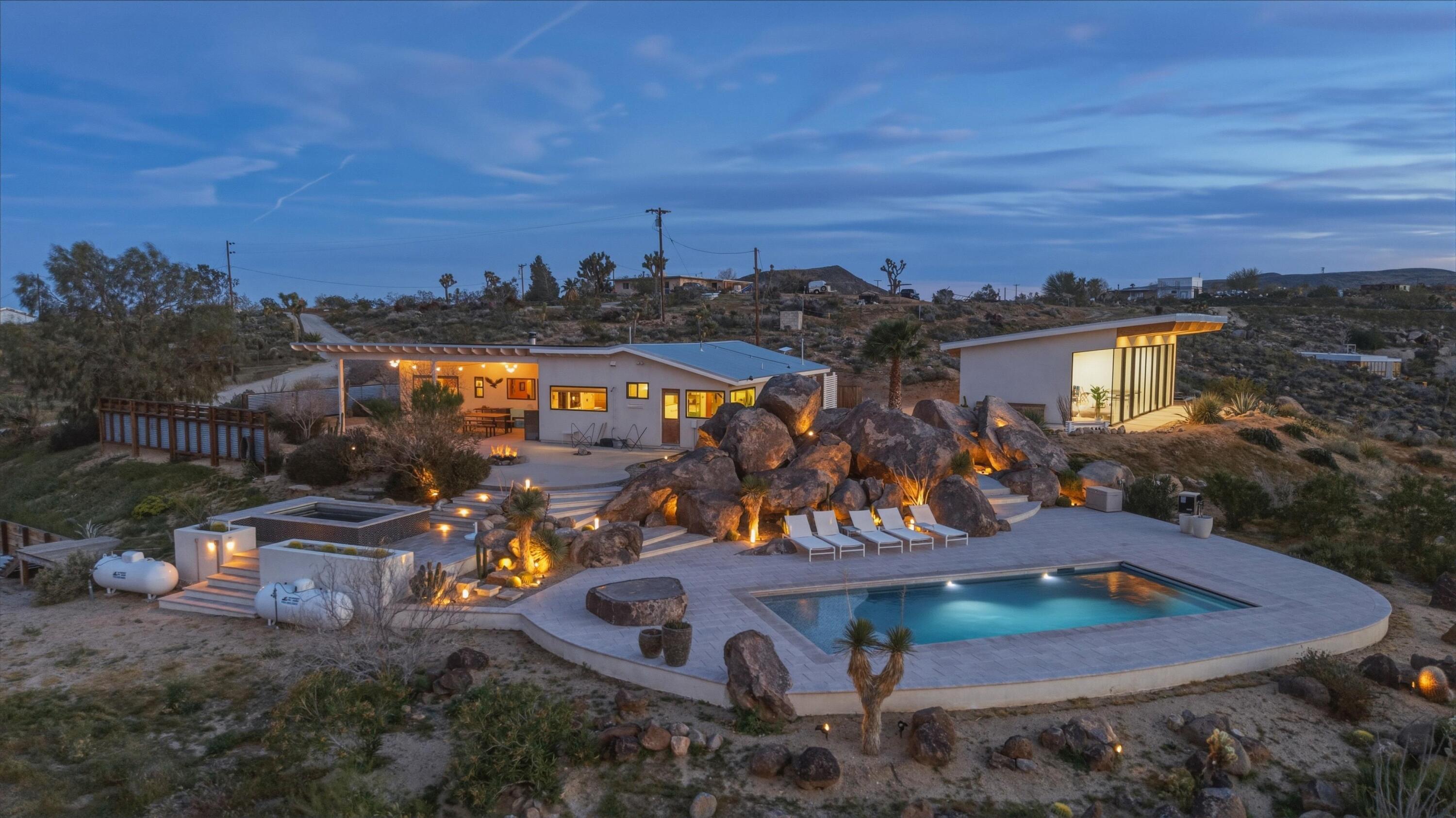 Positioned to capture the sweeping panoramic views of Sand to Snow National Monument, this thoughtfully renovated 1959 residence sits on 5-acres and has become one of the desert's most sought-after destinations for over a decade, ranking among the top 1% of Airbnb guest favorites and frequently selected as a backdrop for commercial productions. The two-bedroom, one-and-a-half-bath main home was taken down to the studs in 2014 and completely reimagined with an open layout that connects seamlessly to the surrounding landscape. The spacious primary suite offers a spa-like bath with stone shower and soaking tub positioned toward the dramatic, boulder-filled desert scenery. Outside, an oversized custom pool and spa overlook the protected wilderness of Sand to Snow National Monument, surrounded by massive granite boulders and thoughtfully designed landscape and lighting that transforms the property after sunset. A 1,000-square-foot climate-controlled garage / flex space with an expansive wall of windows and a dramatic, oversized slider with automated blinds frame unobstructed desert views, filling the space with natural light and constantly shifting desert color. Enjoy as an art studio, game, screening room, or additional gathering space, complete with a beautifully finished bathroom and integrated Sonos sound system. Additional highlights include direct access to endless hiking, owned solar, triple-pane windows, metal roofing, dedicated RV parking which create a home that balances thoughtful design, modern efficiency, and immersive desert living.