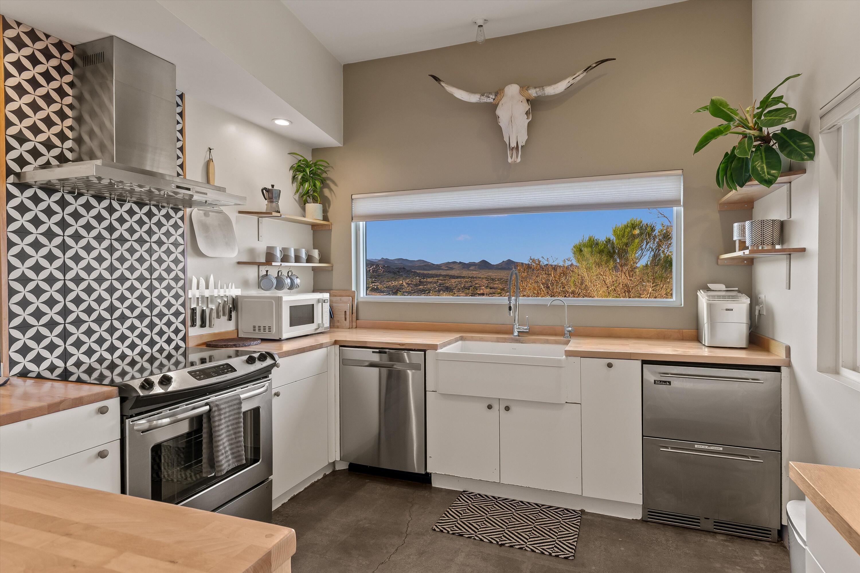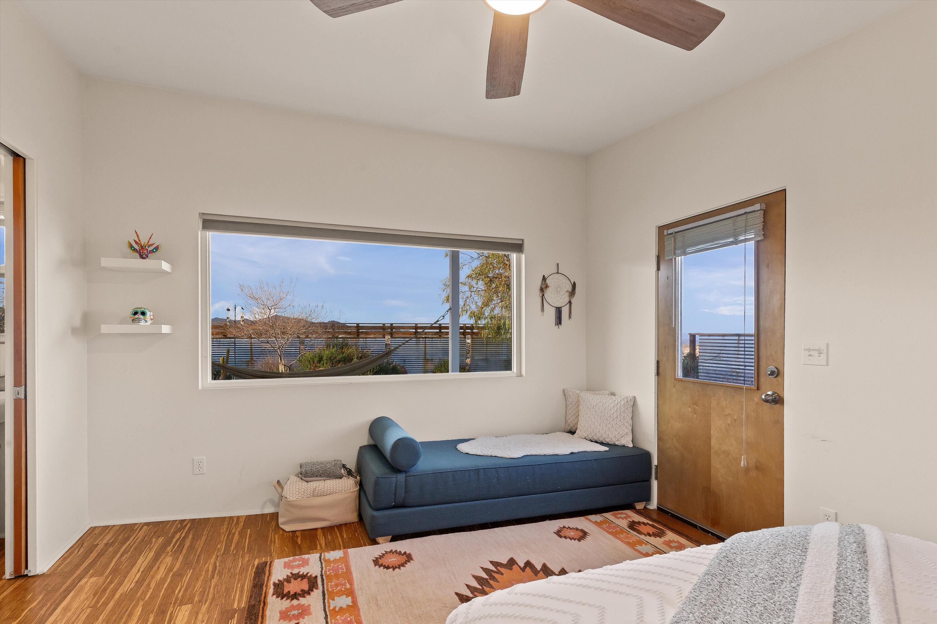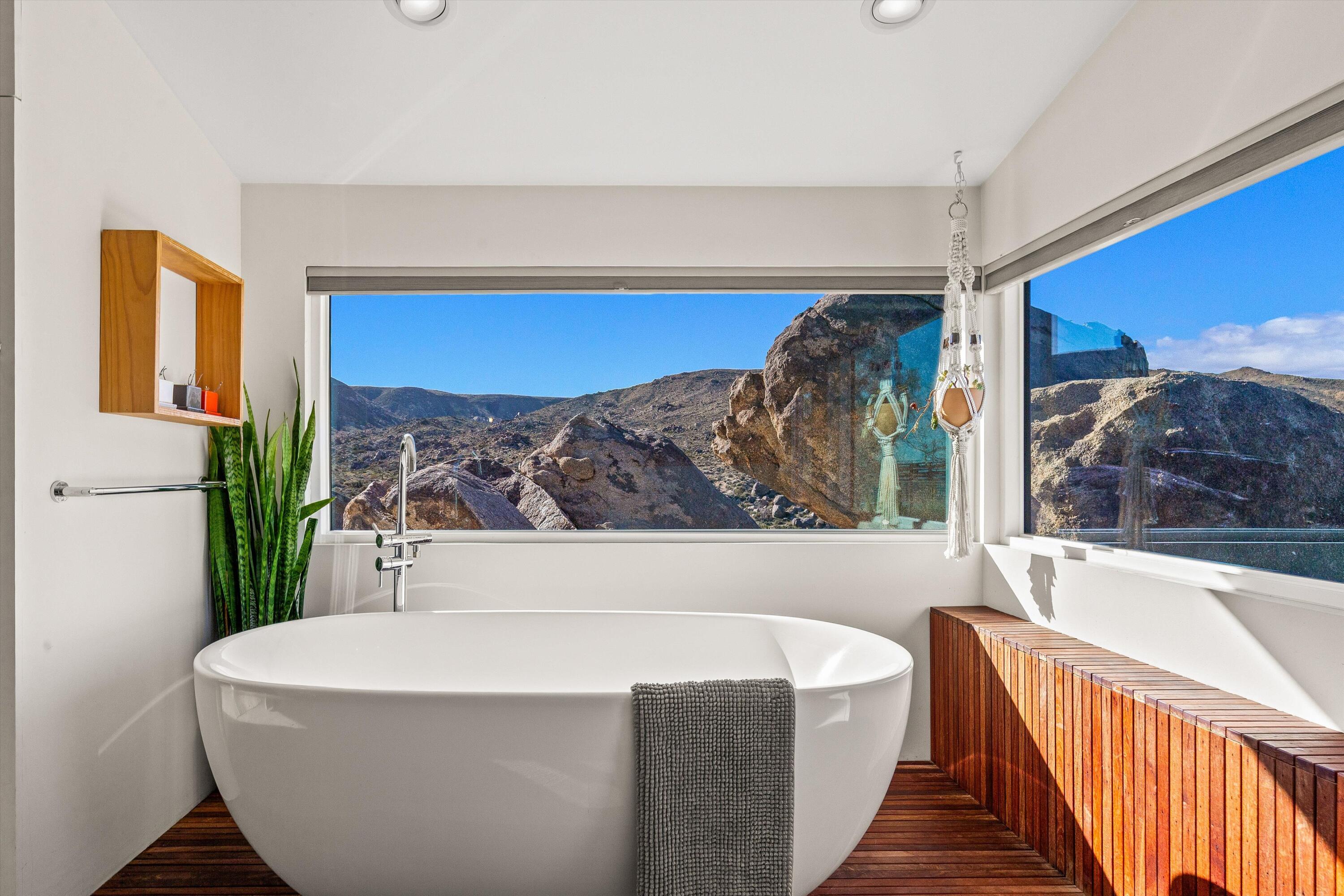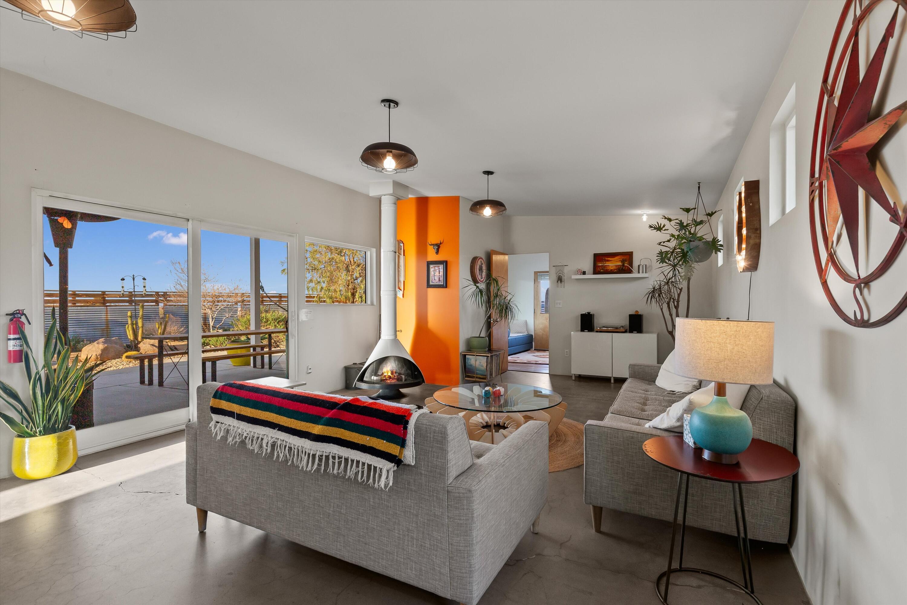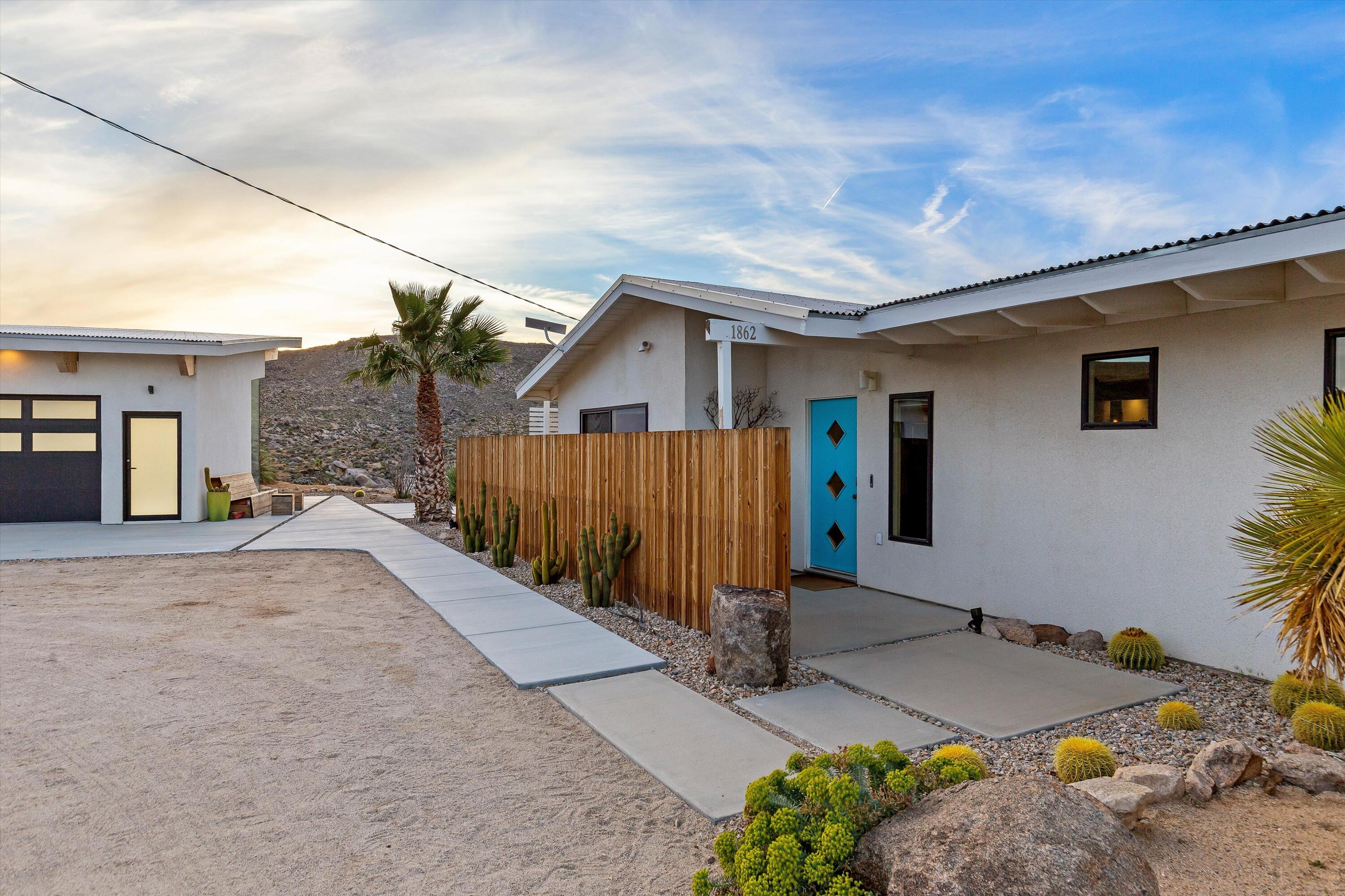 Positioned to capture the sweeping panoramic views of Sand to Snow National Monument, this thoughtfully renovated 1959 residence sits on 5-acres and has become one of the desert's most sought-after destinations for over a decade, ranking among the top 1% of Airbnb guest favorites and frequently selected as a backdrop for commercial productions. The two-bedroom, one-and-a-half-bath main home was taken down to the studs in 2014 and completely reimagined with an open layout that connects seamlessly to the surrounding landscape. The spacious primary suite offers a spa-like bath with stone shower and soaking tub positioned toward the dramatic, boulder-filled desert scenery. Outside, an oversized custom pool and spa overlook the protected wilderness of Sand to Snow National Monument, surrounded by massive granite boulders and thoughtfully designed landscape and lighting that transforms the property after sunset. A 1,000-square-foot climate-controlled garage / flex space with an expansive wall of windows and a dramatic, oversized slider with automated blinds frame unobstructed desert views, filling the space with natural light and constantly shifting desert color. Enjoy as an art studio, game, screening room, or additional gathering space, complete with a beautifully finished bathroom and integrated Sonos sound system. Additional highlights include direct access to endless hiking, owned solar, triple-pane windows, metal roofing, dedicated RV parking which create a home that balances thoughtful design, modern efficiency, and immersive desert living.