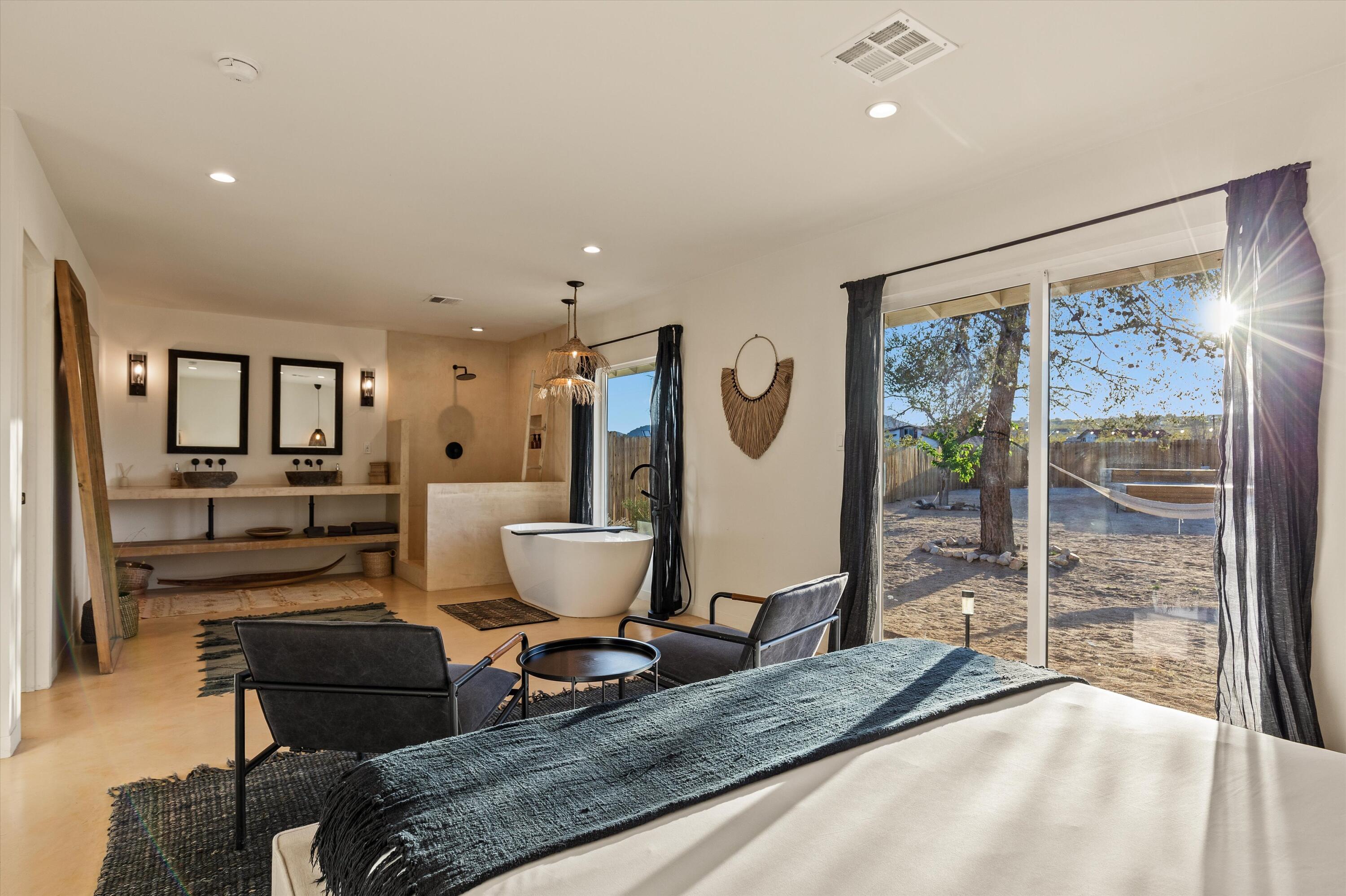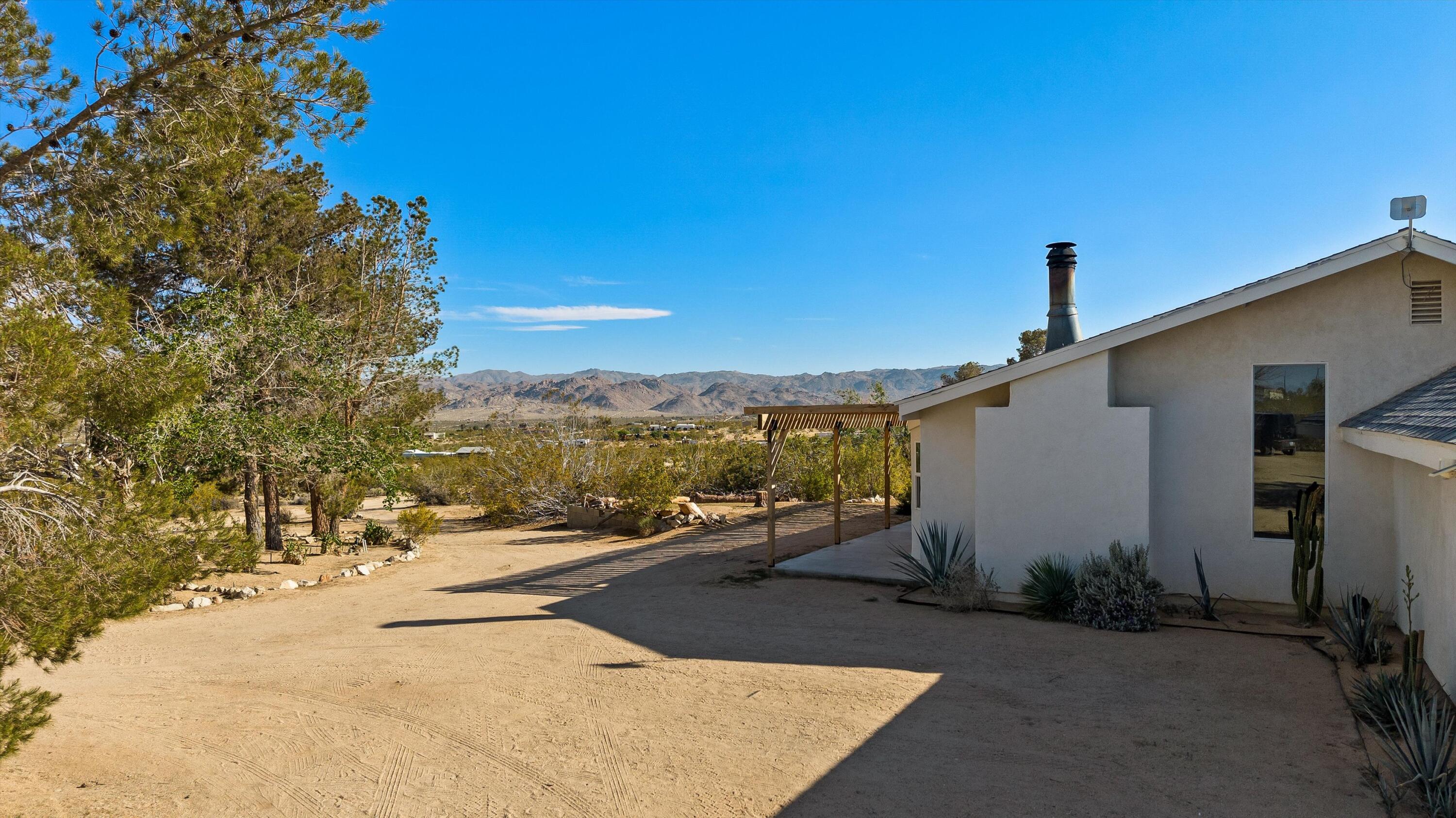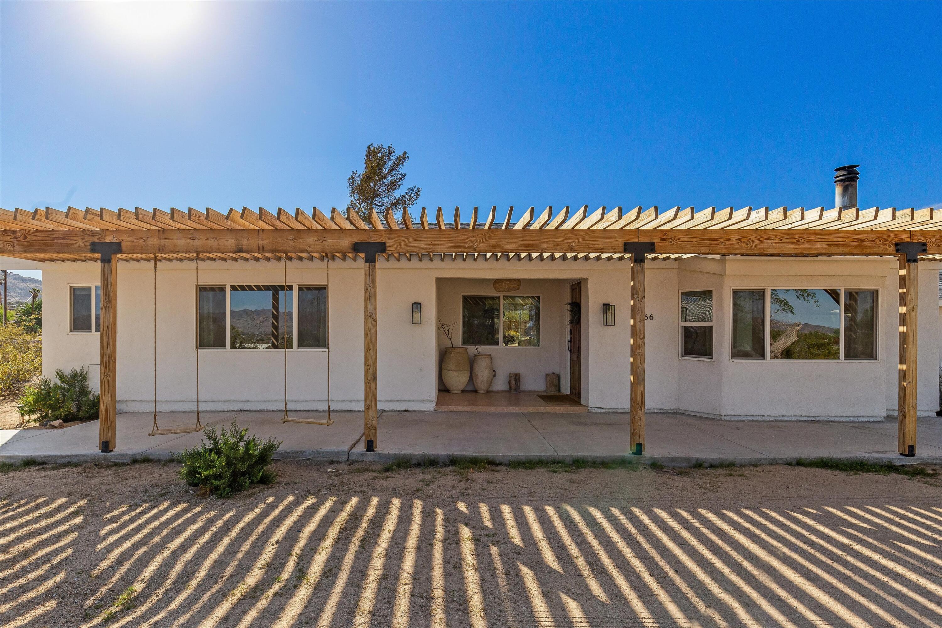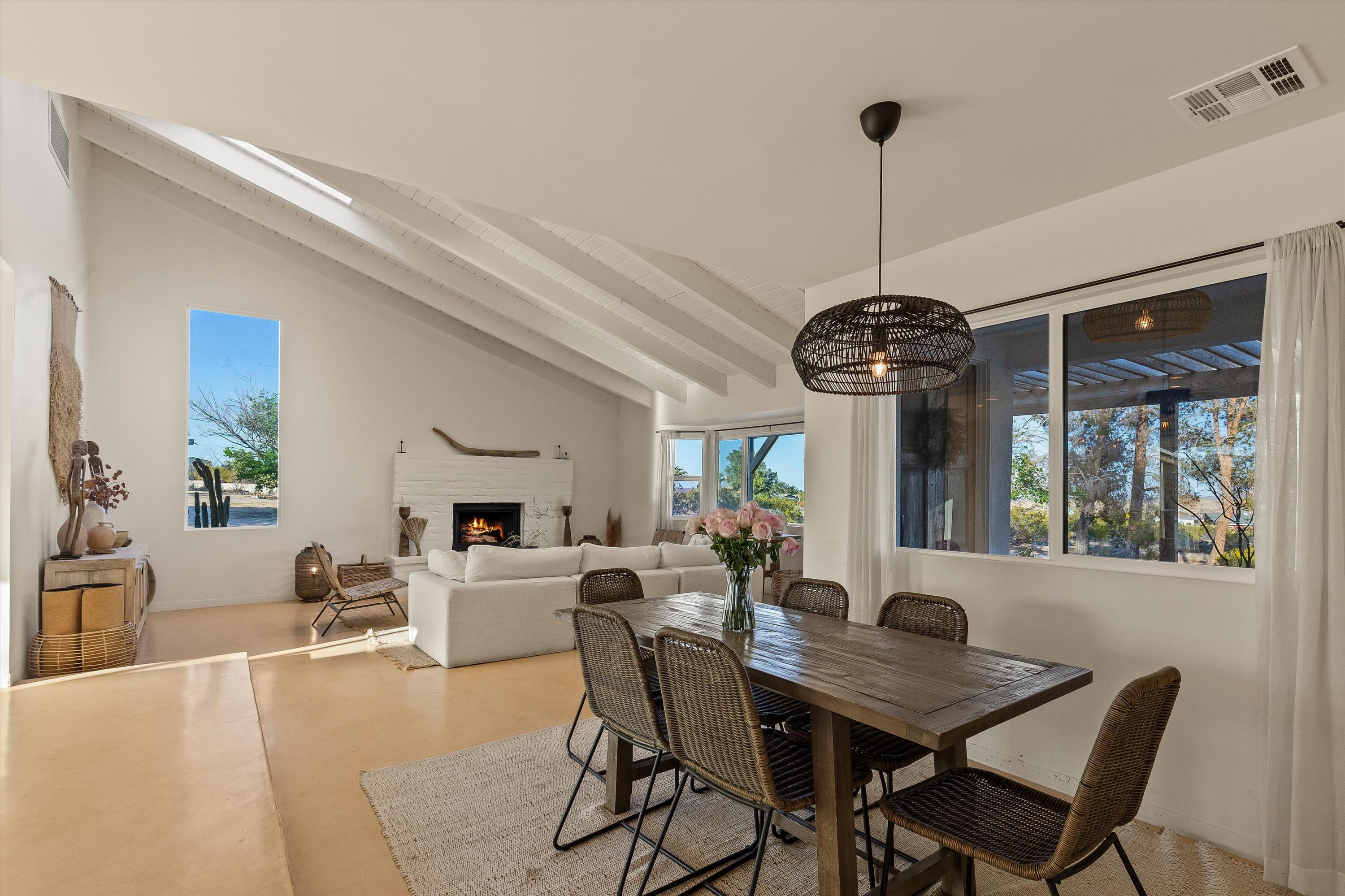 Tucked back from the road just enough, this thoughtfully updated and peaceful Joshua Tree retreat offers a perfect balance of privacy and style. Featuring beautifully finished concrete floors, an open-concept living space, a well-appointed kitchen with large island, and a sun-filled living room with soaring ceilings, skylight, and brick fireplace. The primary bedroom suite is a true retreat, complete with a large soaking tub and striking walk-in shower. Two spacious guest bedrooms and beautiful baths offer plenty of space for visitors to relax and unwind. Attention to detail shines throughout the design of this home, which presents a cohesive and inviting aesthetic. Spanning two lots totaling 2.33 acres (additional APN included in sale) and boasting a sundeck with jacuzzi, refreshing stock-tank pool, mature shade trees, and a detached 2-car garage, this property provides ample space and privacy for all of your indoor and outdoor activities. Take in the sunrise and mountain views from the front porch swings, and enjoy sunsets and stargazing around the fire in the private backyard. Currently operating as a popular short-term rental, this home is an ideal opportunity for a full-time residence, second home, or investment property.