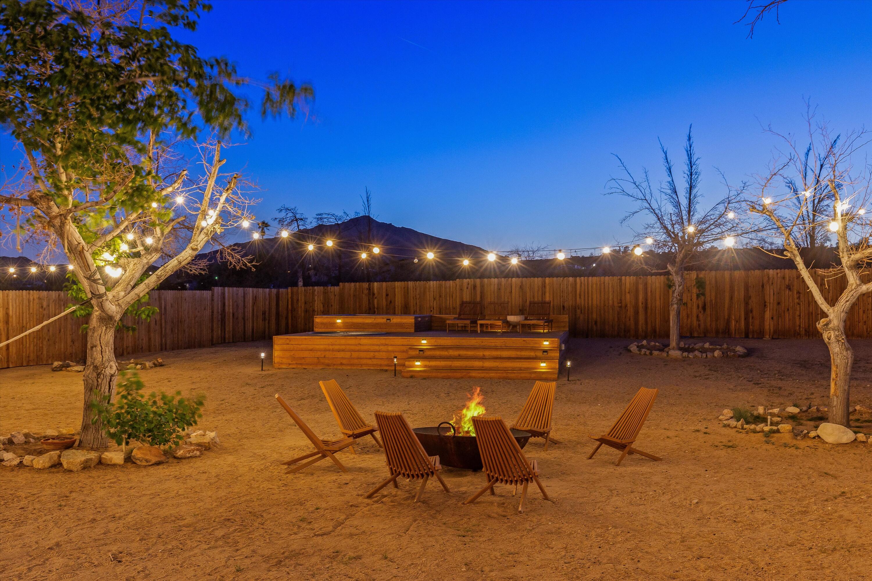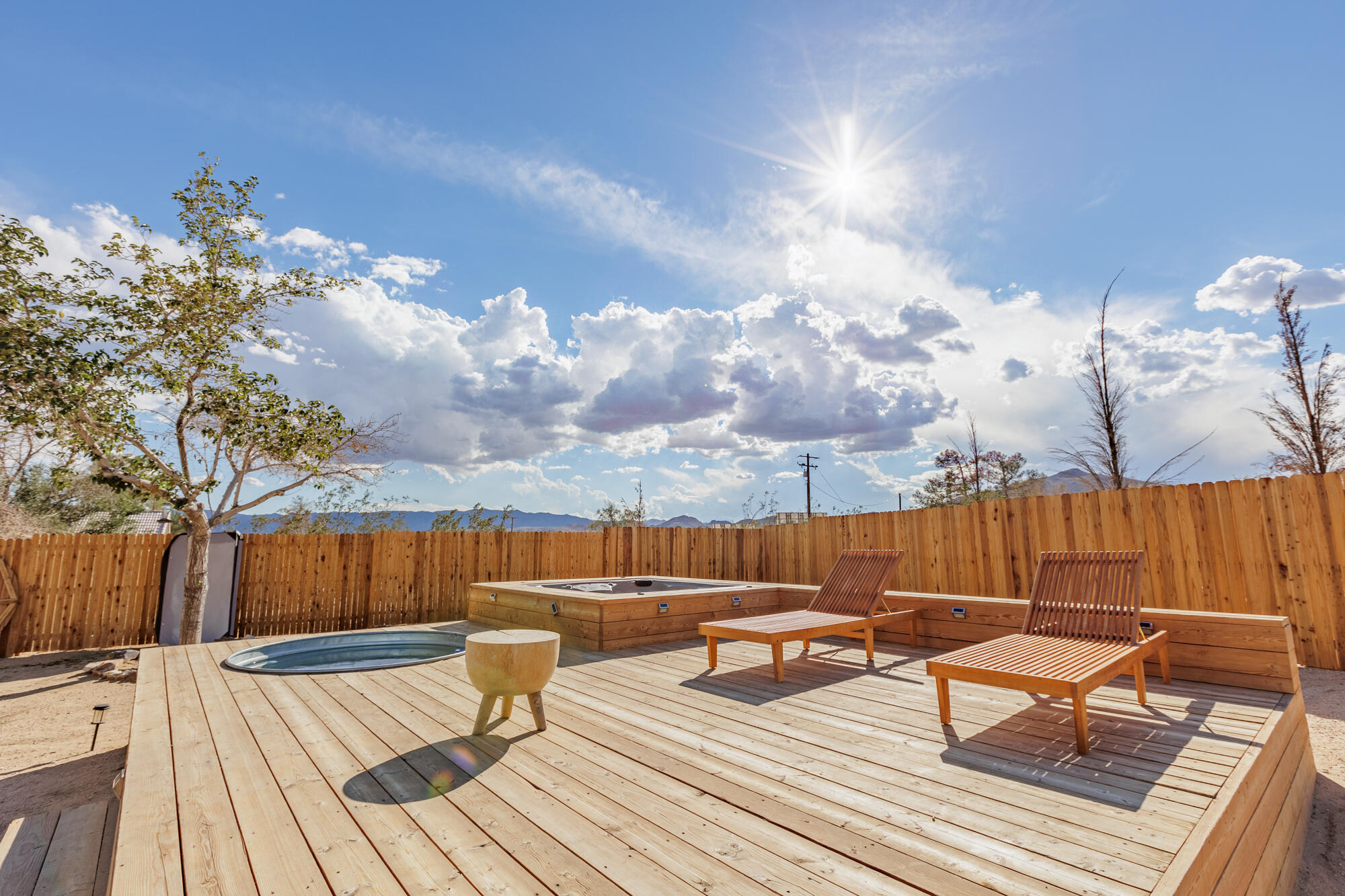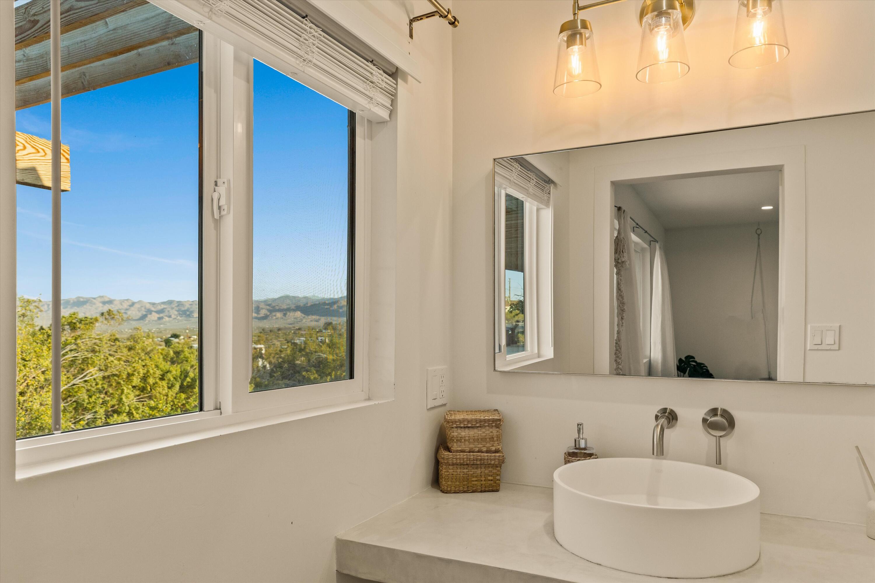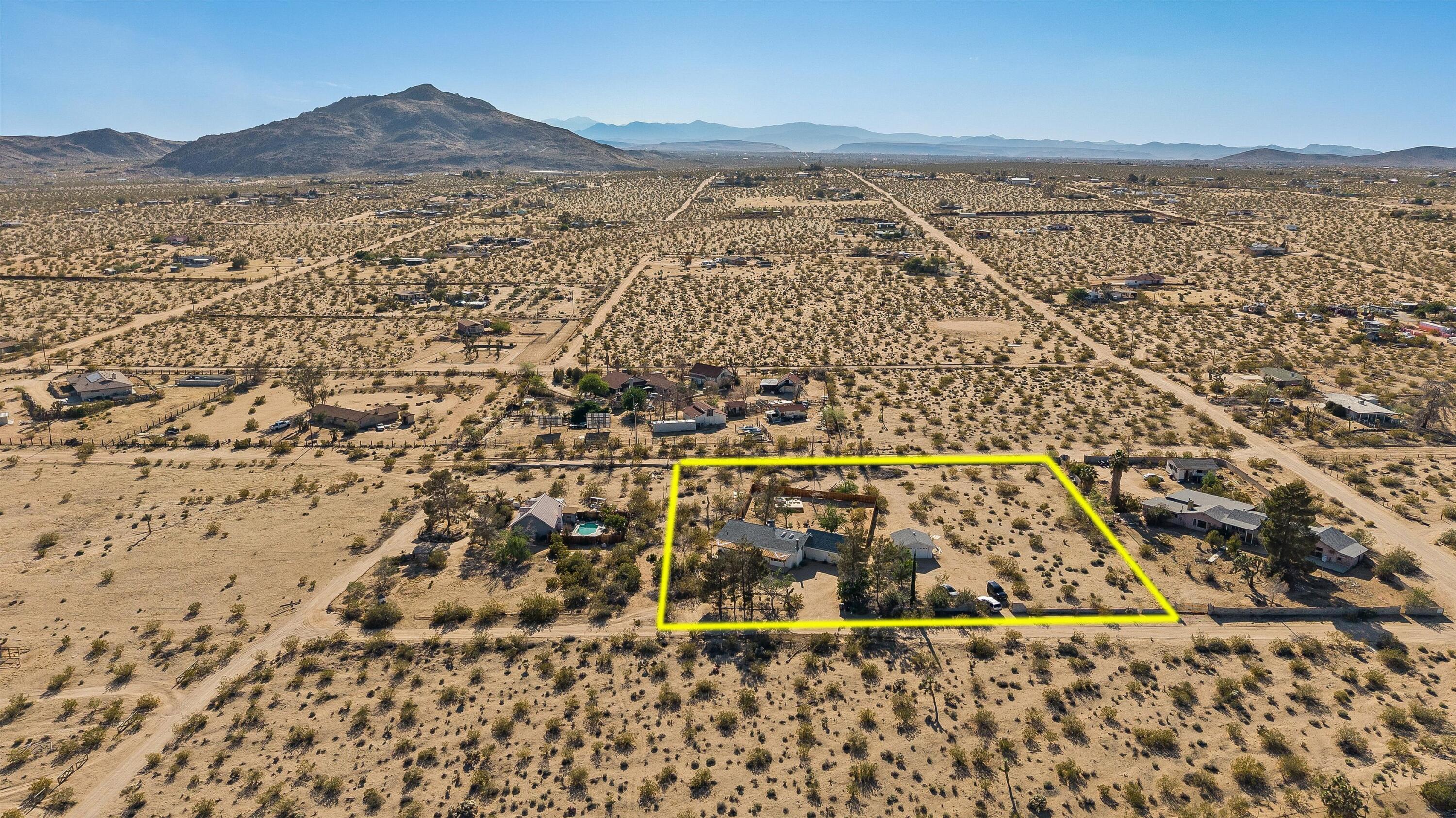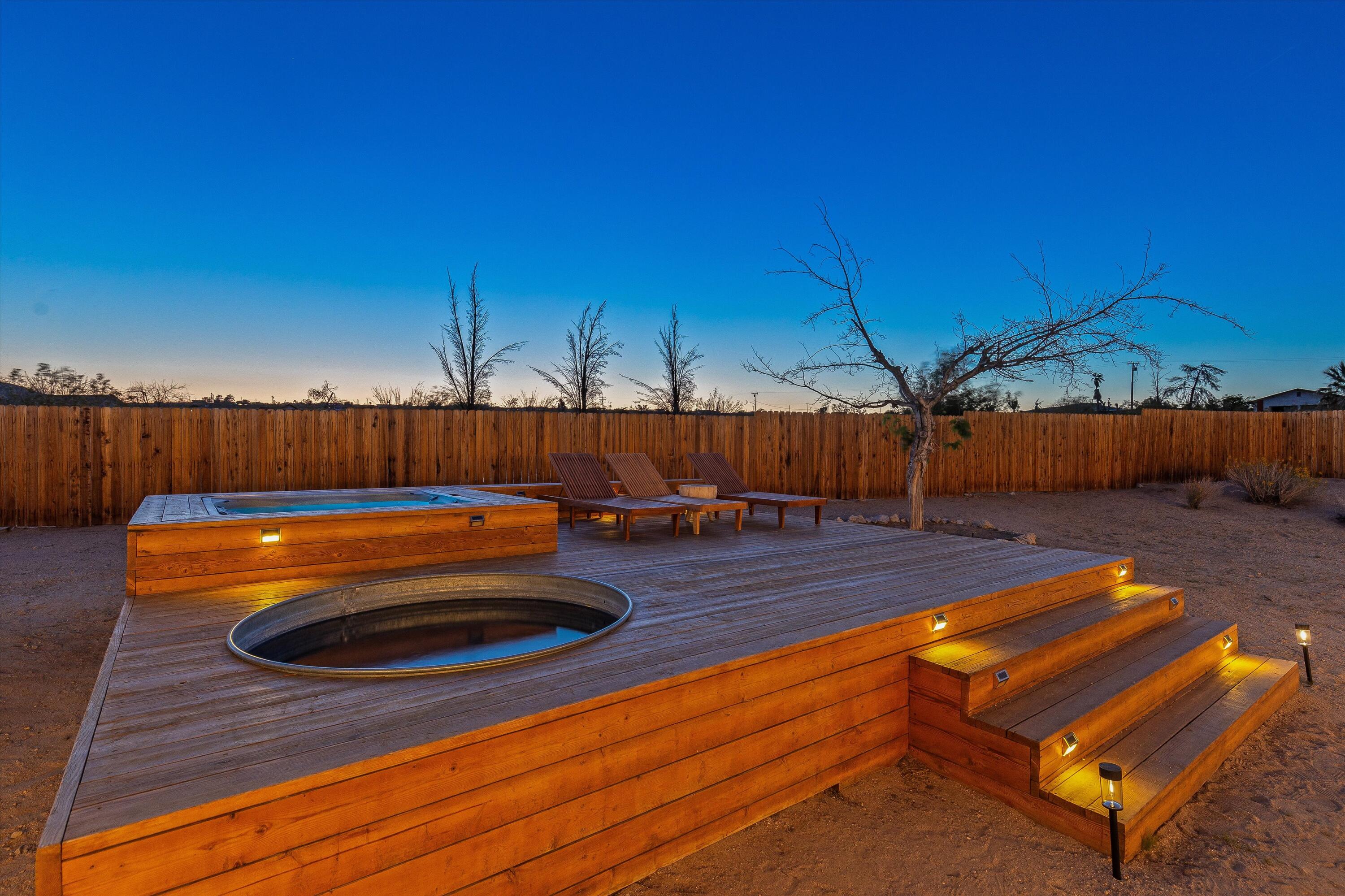 Tucked back from the road just enough, this thoughtfully updated and peaceful Joshua Tree retreat offers a perfect balance of privacy and style. Featuring beautifully finished concrete floors, an open-concept living space, a well-appointed kitchen with large island, and a sun-filled living room with soaring ceilings, skylight, and brick fireplace. The primary bedroom suite is a true retreat, complete with a large soaking tub and striking walk-in shower. Two spacious guest bedrooms and beautiful baths offer plenty of space for visitors to relax and unwind. Attention to detail shines throughout the design of this home, which presents a cohesive and inviting aesthetic. Spanning two lots totaling 2.33 acres (additional APN included in sale) and boasting a sundeck with jacuzzi, refreshing stock-tank pool, mature shade trees, and a detached 2-car garage, this property provides ample space and privacy for all of your indoor and outdoor activities. Take in the sunrise and mountain views from the front porch swings, and enjoy sunsets and stargazing around the fire in the private backyard. Currently operating as a popular short-term rental, this home is an ideal opportunity for a full-time residence, second home, or investment property.