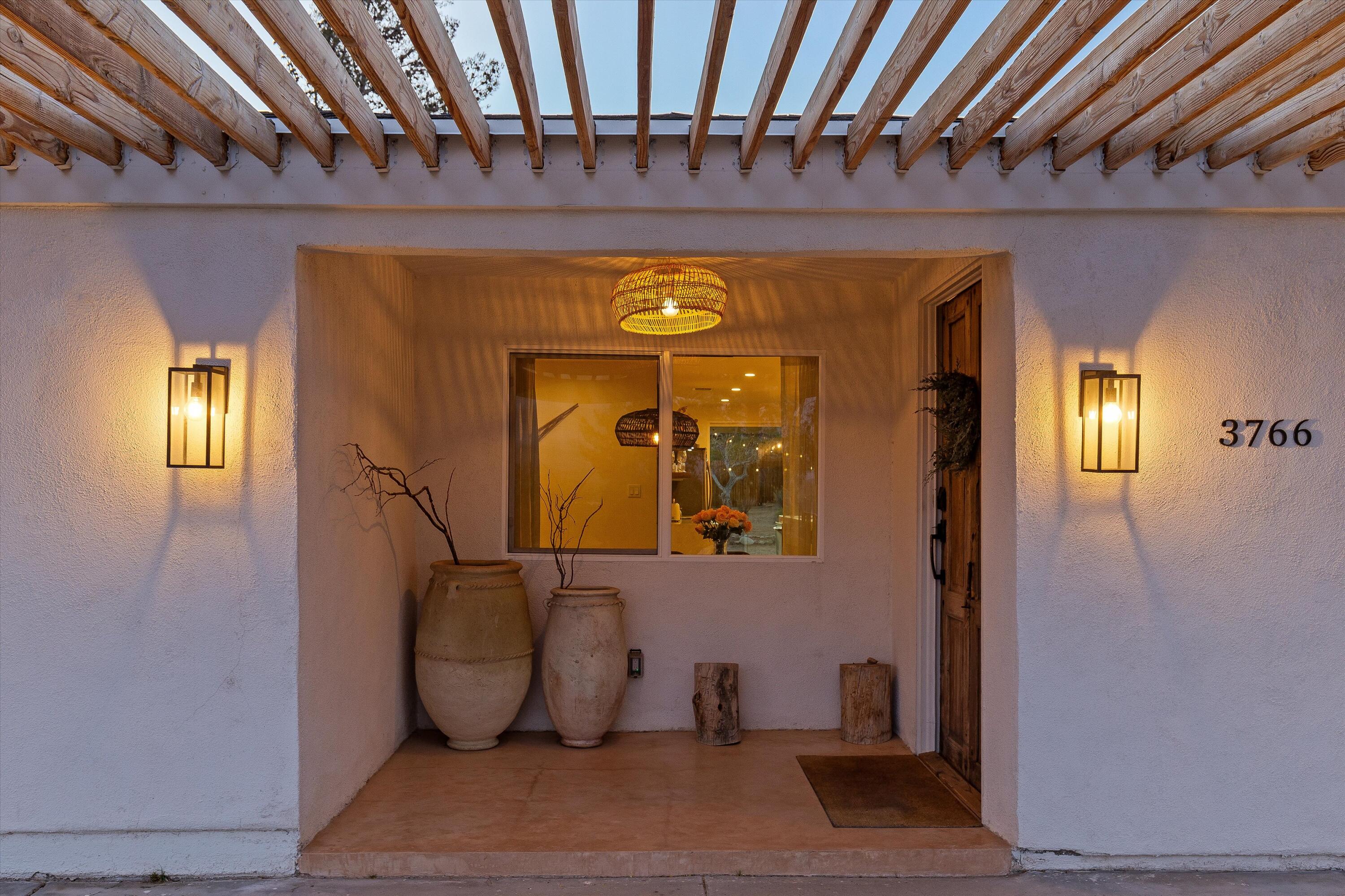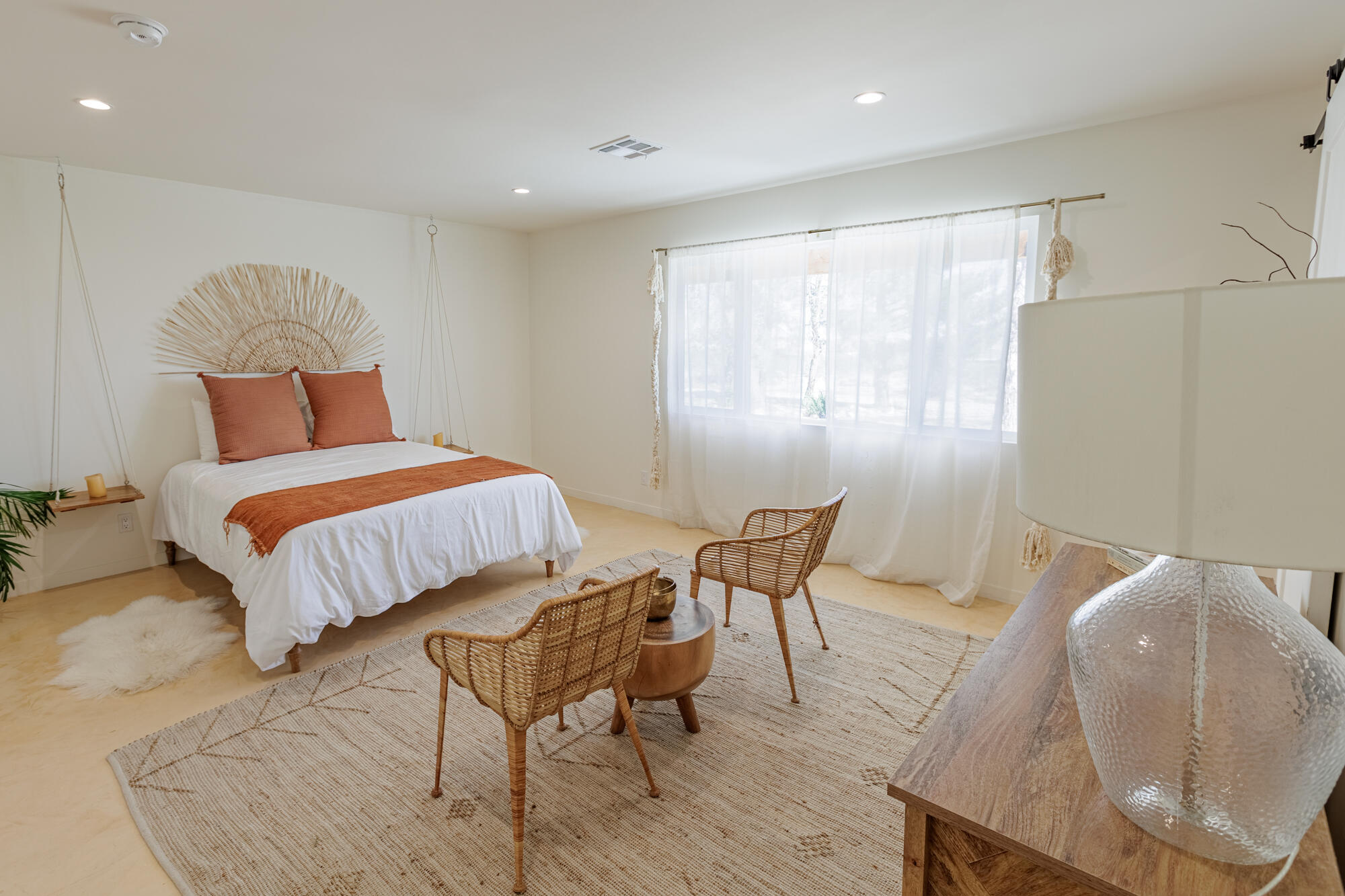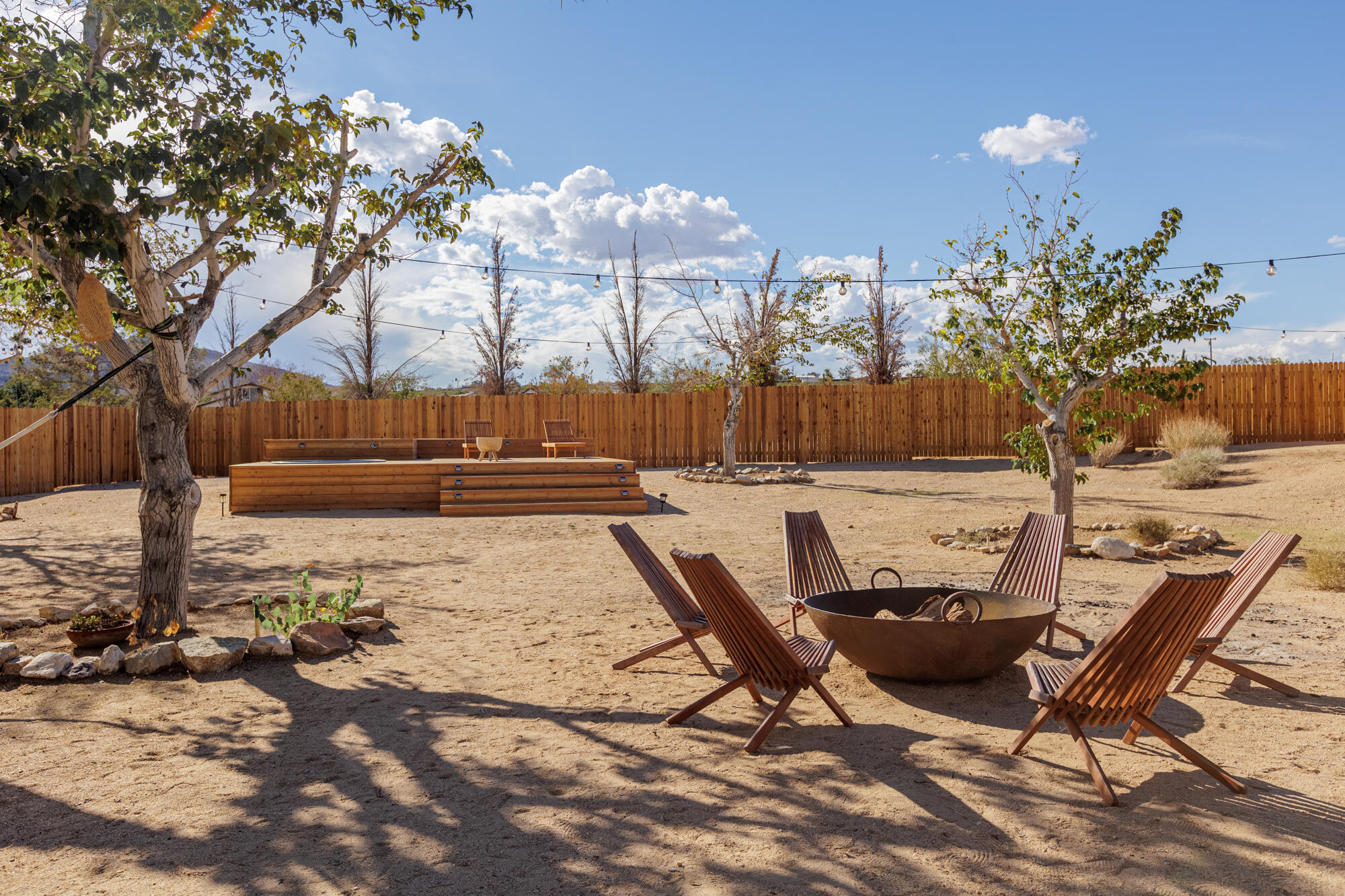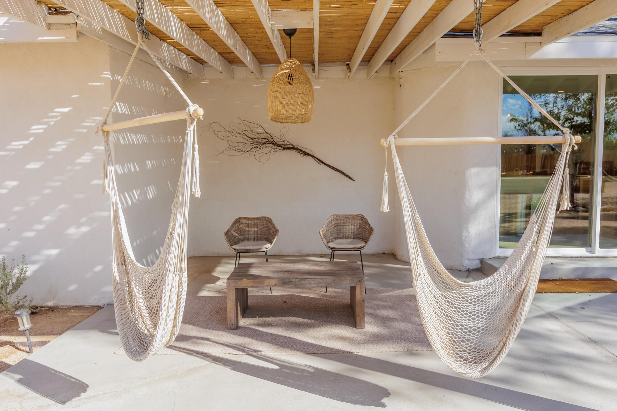 Tucked back from the road just enough, this thoughtfully updated and peaceful Joshua Tree retreat offers a perfect balance of privacy and style. Featuring beautifully finished concrete floors, an open-concept living space, a well-appointed kitchen with large island, and a sun-filled living room with soaring ceilings, skylight, and brick fireplace. The primary bedroom suite is a true retreat, complete with a large soaking tub and striking walk-in shower. Two spacious guest bedrooms and beautiful baths offer plenty of space for visitors to relax and unwind. Attention to detail shines throughout the design of this home, which presents a cohesive and inviting aesthetic. Spanning two lots totaling 2.33 acres (additional APN included in sale) and boasting a sundeck with jacuzzi, refreshing stock-tank pool, mature shade trees, and a detached 2-car garage, this property provides ample space and privacy for all of your indoor and outdoor activities. Take in the sunrise and mountain views from the front porch swings, and enjoy sunsets and stargazing around the fire in the private backyard. Currently operating as a popular short-term rental, this home is an ideal opportunity for a full-time residence, second home, or investment property.
