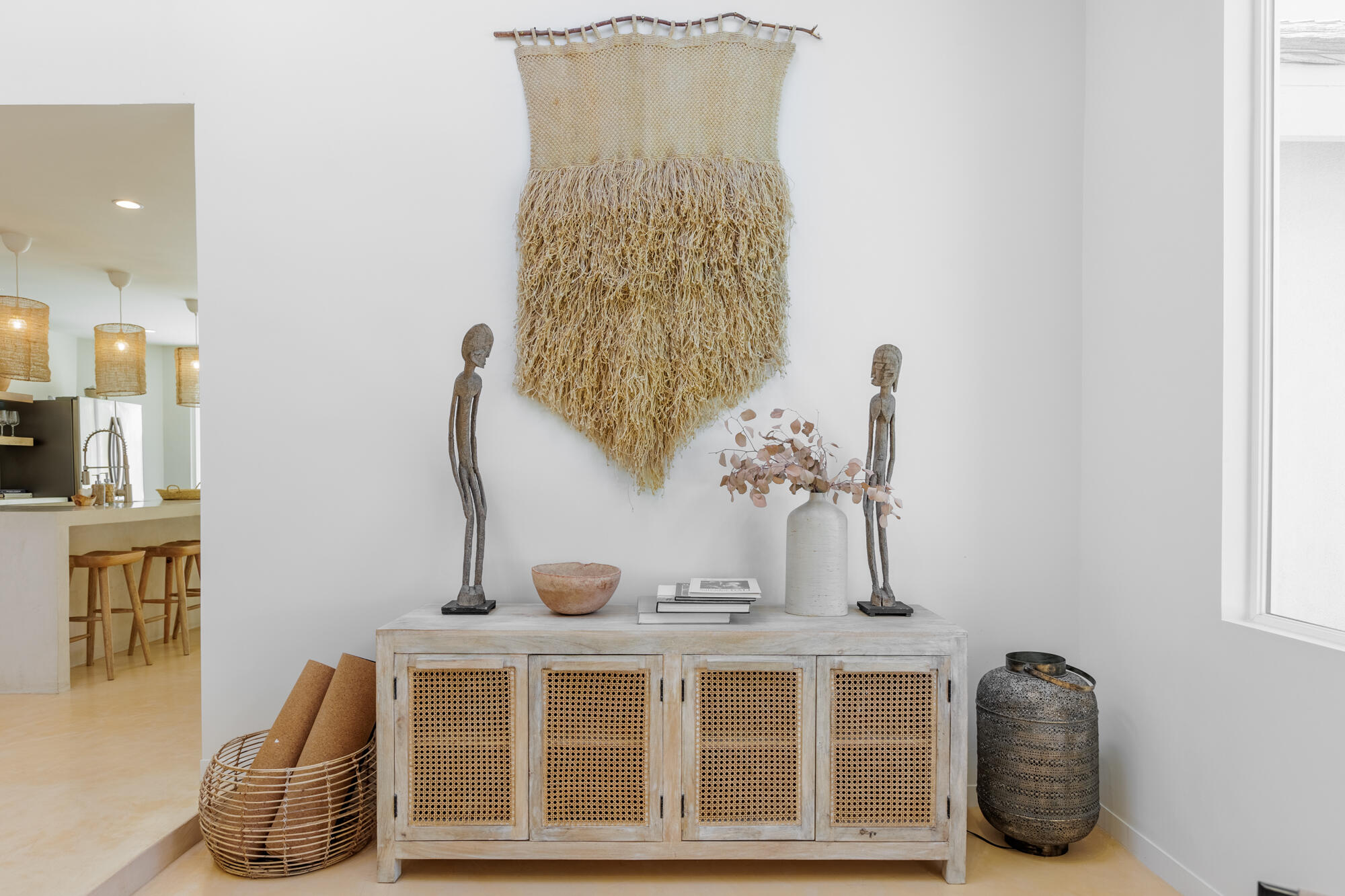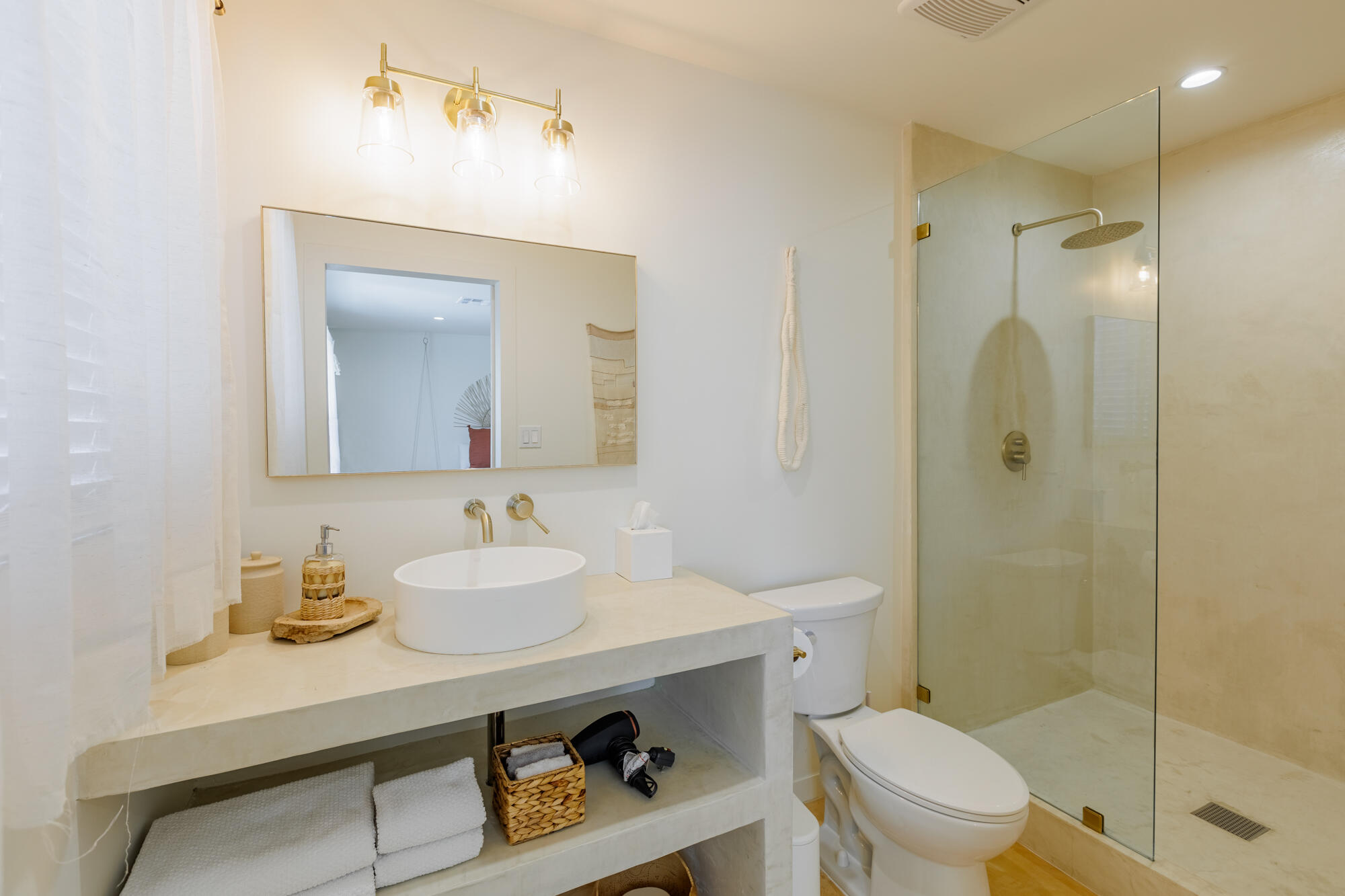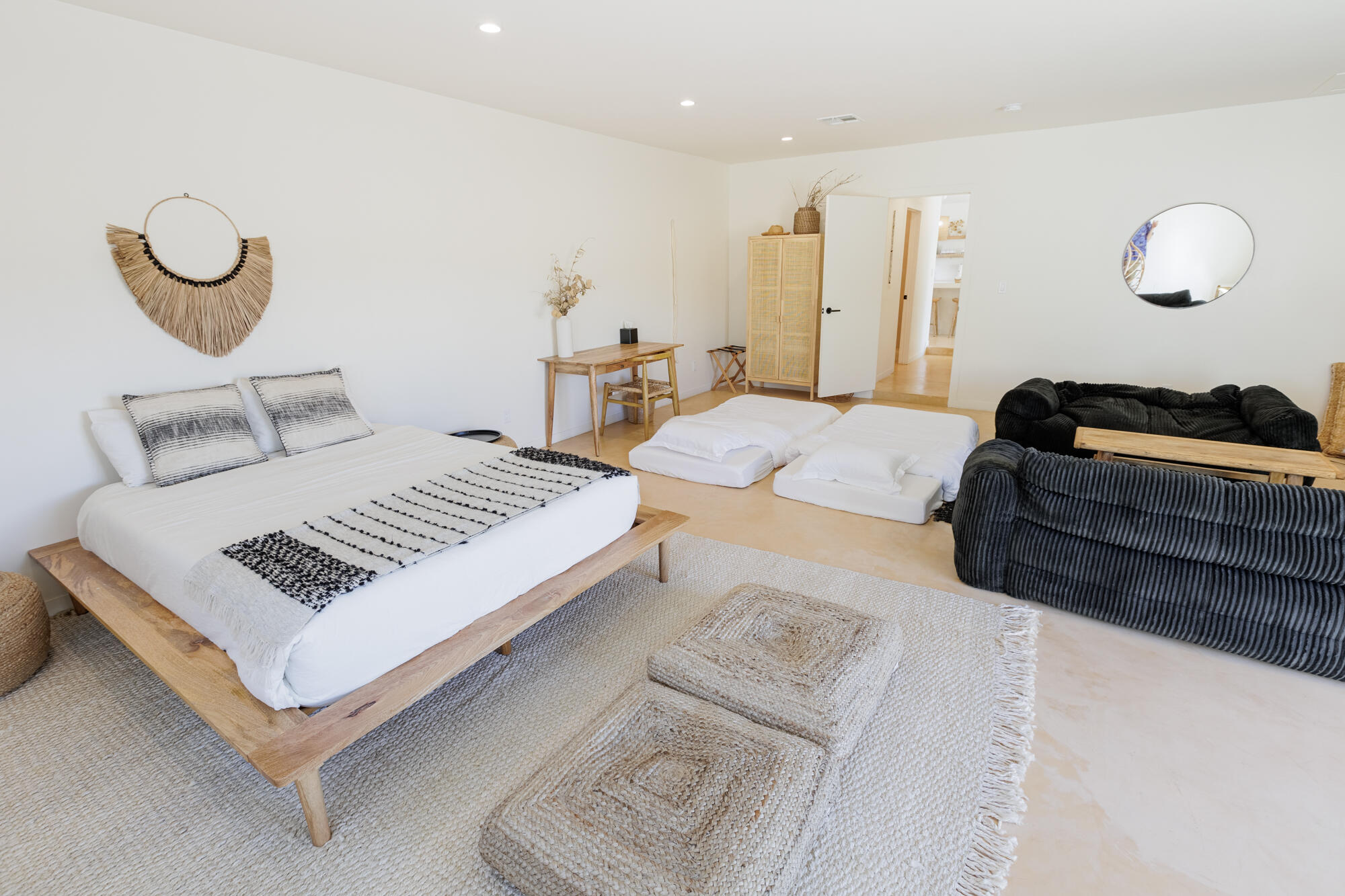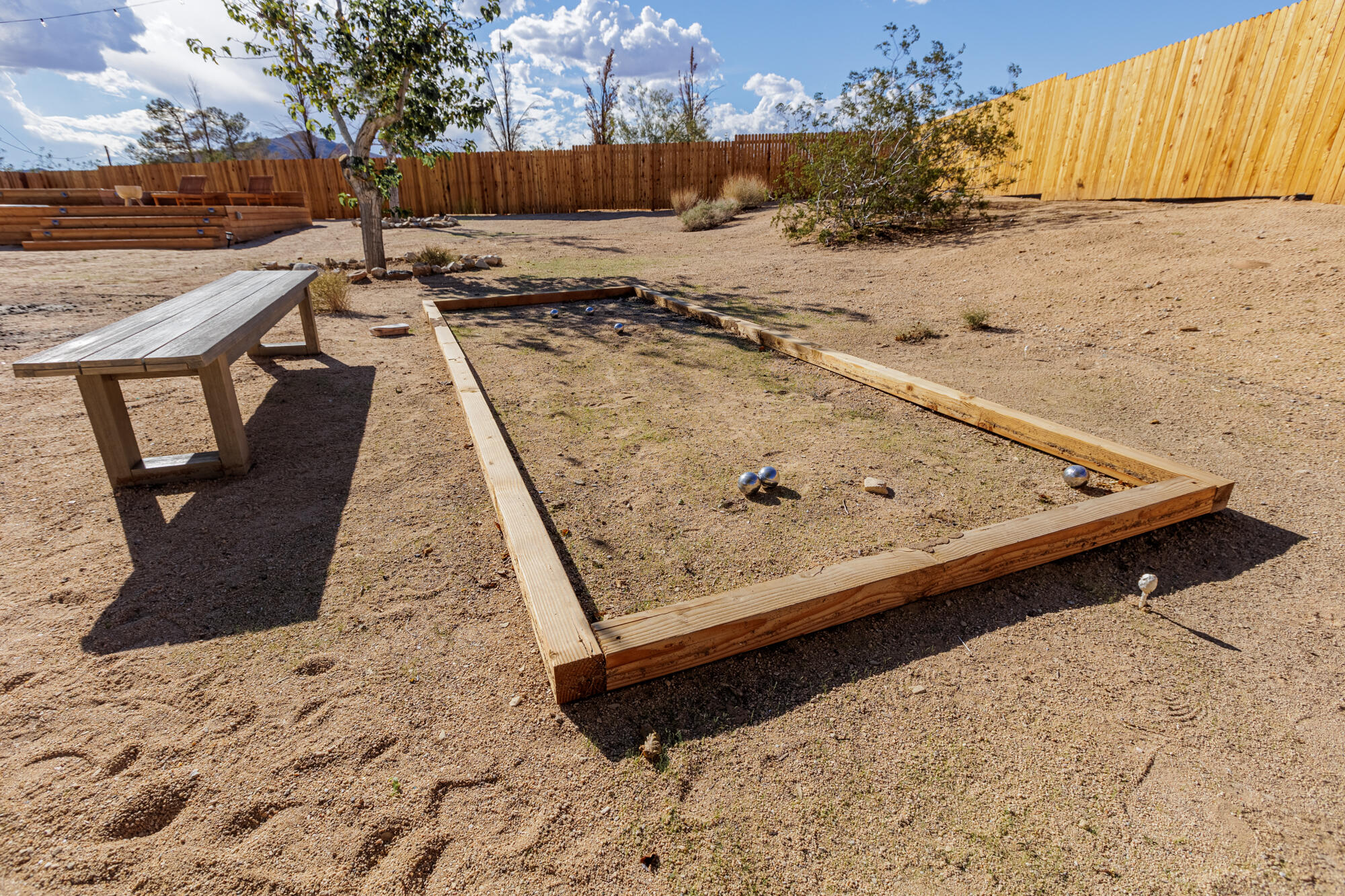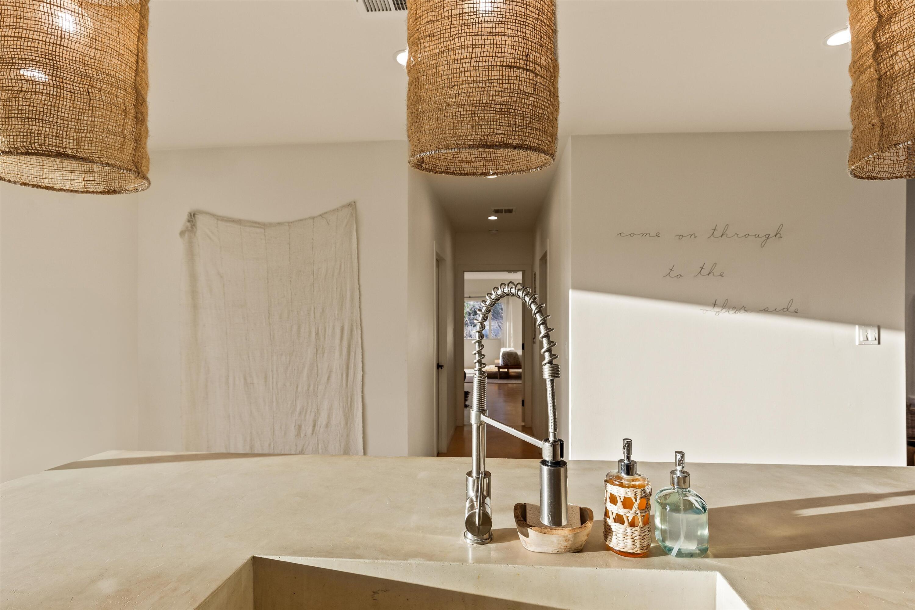 Tucked back from the road just enough, this thoughtfully updated and peaceful Joshua Tree retreat offers a perfect balance of privacy and style. Featuring beautifully finished concrete floors, an open-concept living space, a well-appointed kitchen with large island, and a sun-filled living room with soaring ceilings, skylight, and brick fireplace. The primary bedroom suite is a true retreat, complete with a large soaking tub and striking walk-in shower. Two spacious guest bedrooms and beautiful baths offer plenty of space for visitors to relax and unwind. Attention to detail shines throughout the design of this home, which presents a cohesive and inviting aesthetic. Spanning two lots totaling 2.33 acres (additional APN included in sale) and boasting a sundeck with jacuzzi, refreshing stock-tank pool, mature shade trees, and a detached 2-car garage, this property provides ample space and privacy for all of your indoor and outdoor activities. Take in the sunrise and mountain views from the front porch swings, and enjoy sunsets and stargazing around the fire in the private backyard. Currently operating as a popular short-term rental, this home is an ideal opportunity for a full-time residence, second home, or investment property.