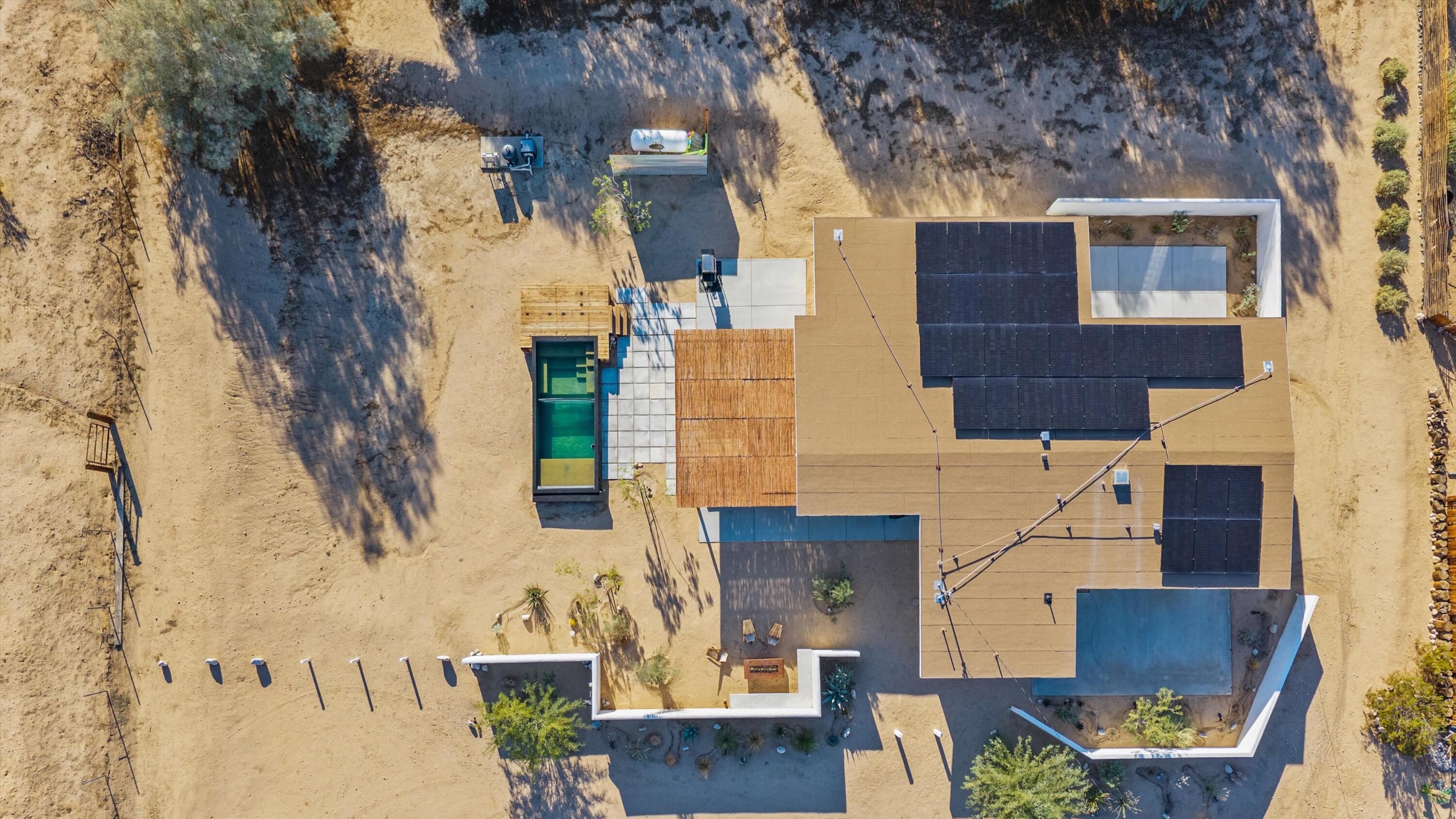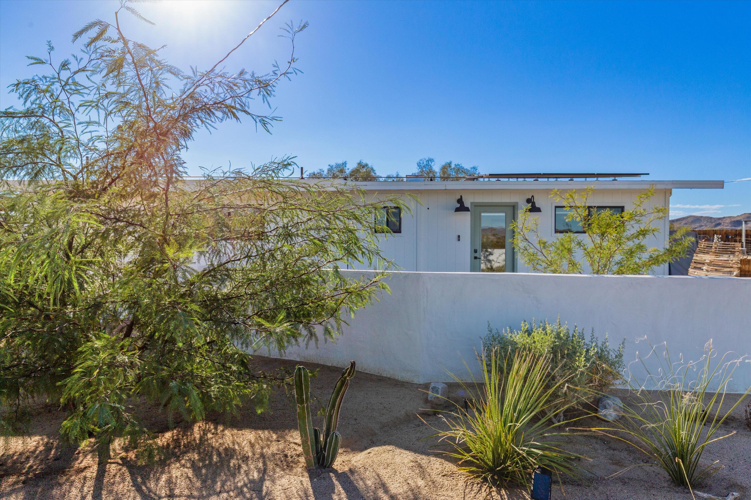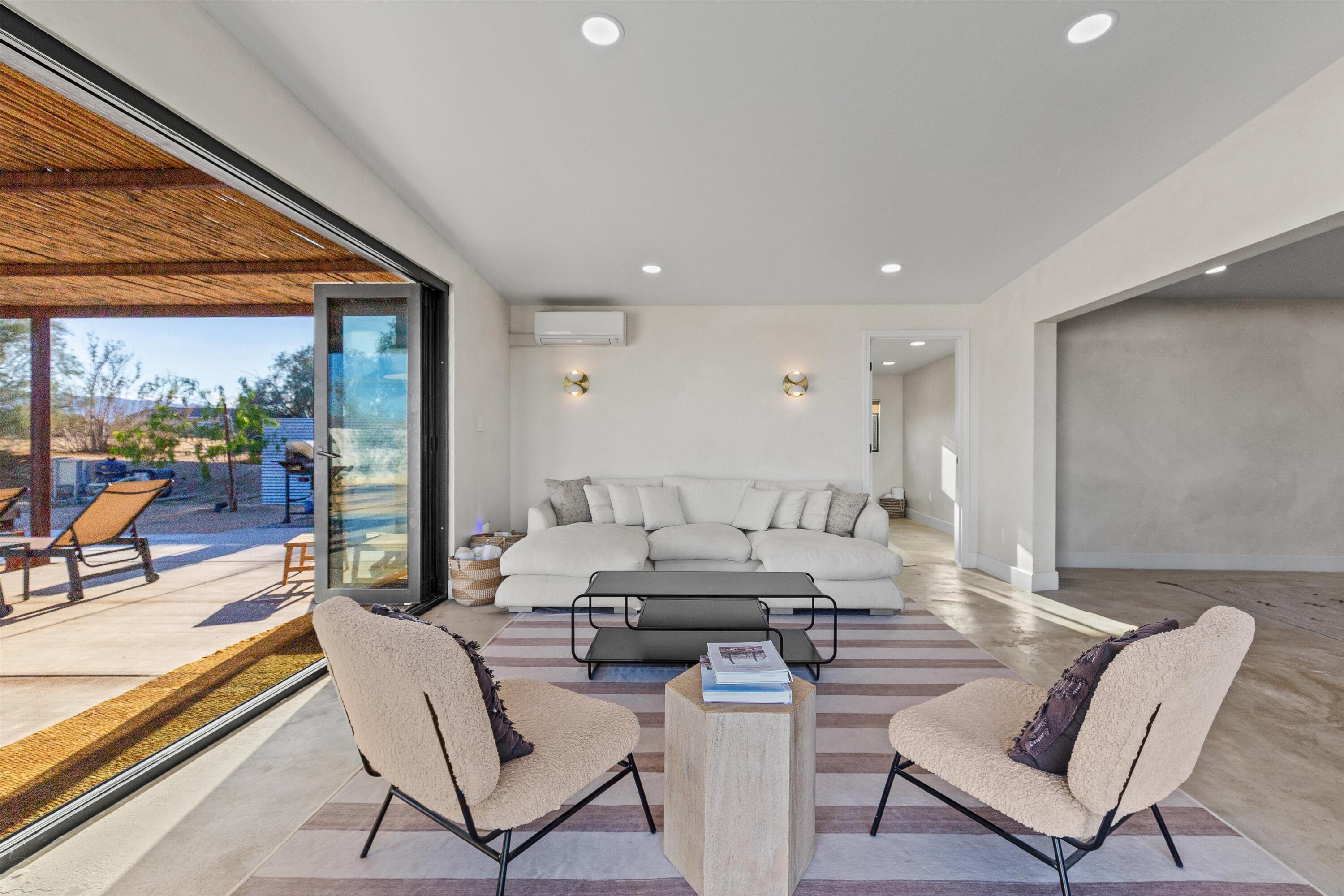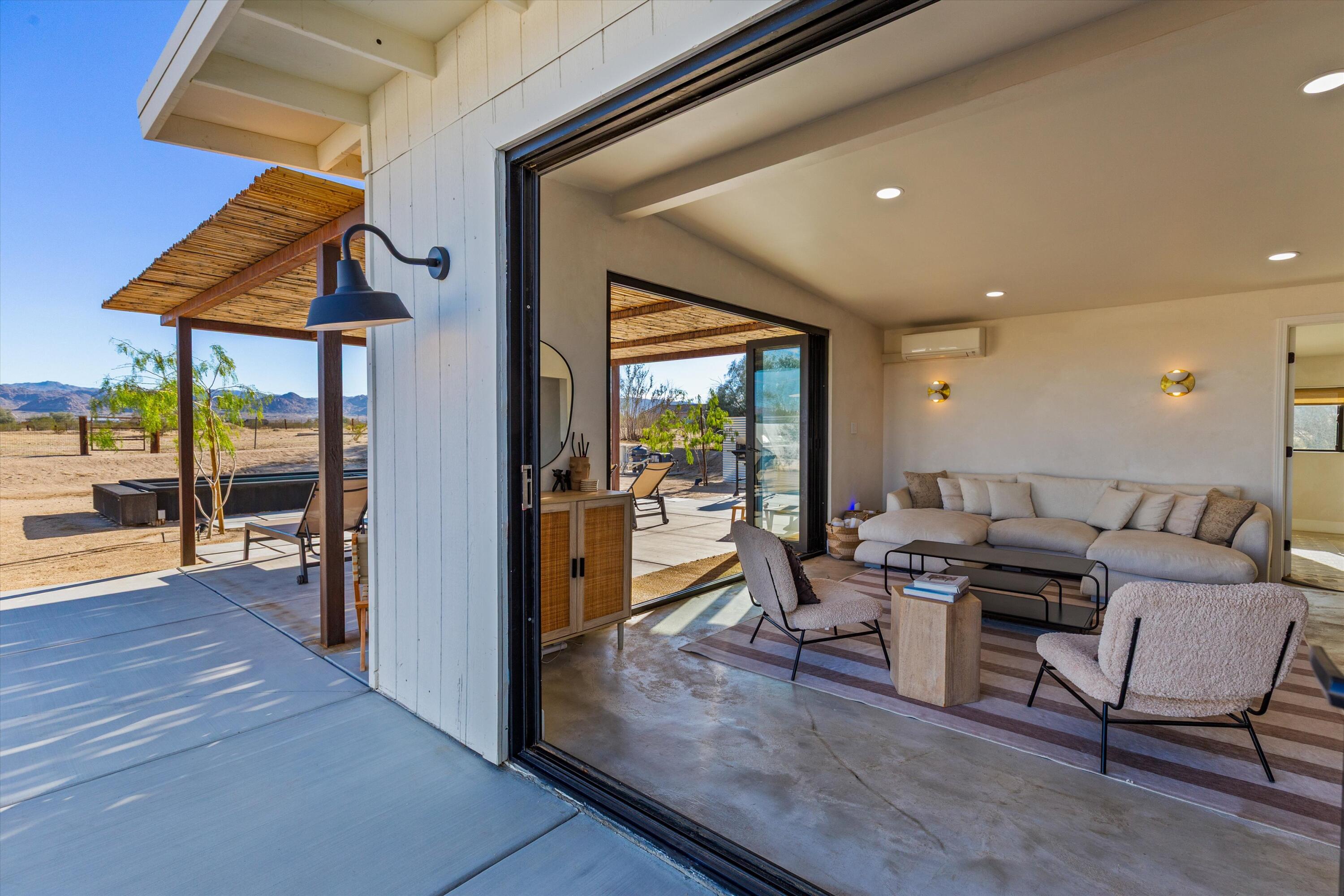 Nestled on a pristine 3-acre parcel in the heart of Joshua Tree, 4610 Sunkist Road is a one-of-a-kind architectural retreat blending refined Mediterranean influences with modern desert minimalism. This 3-bedroom, 1-bathroom home spans 1,568 sq ft and has been meticulously reimagined with a design sensibility rarely found in the high desert. Currently utilized as a top-performing, meticulously maintained Airbnb.Design-forward details include smooth plaster walls, polished concrete floors, handcrafted tiles, and expansive folding glass doors that dissolve the boundary between indoors and out. A luminous open kitchen, two distinct living areas, and curated finishes throughout create a space as functional as it is striking.Step outside to a heated Modpool/spa, sculptural fire feature, shaded lounge areas, and panoramic views framed by olive trees and southern mountains. With 32 owned solar panels, EV charging, and a fully fenced footprint, this ultra-private, turnkey haven is just 8 minutes from the park--perfect for discerning buyers seeking a unique retreat and great investment opportunity.