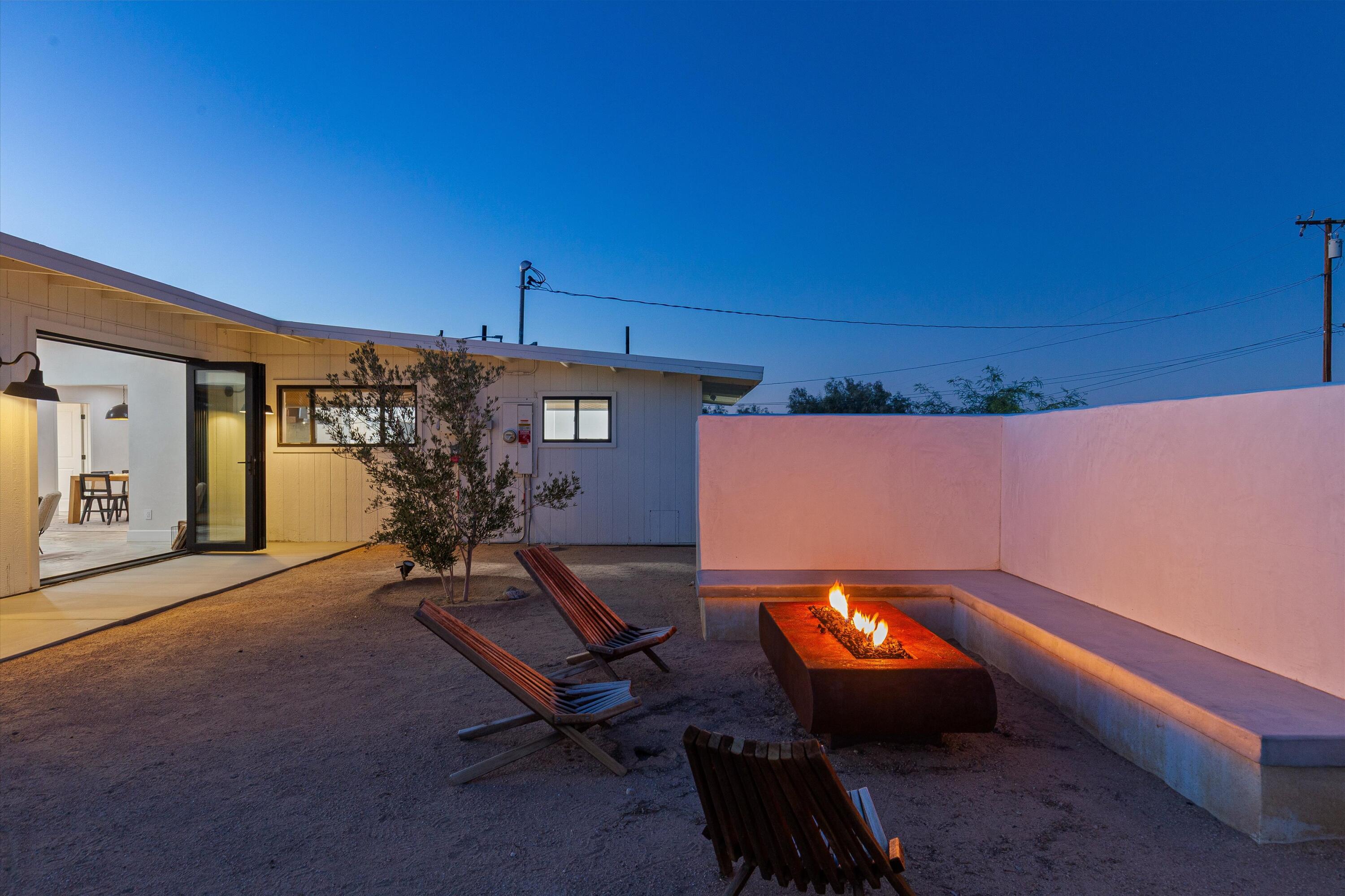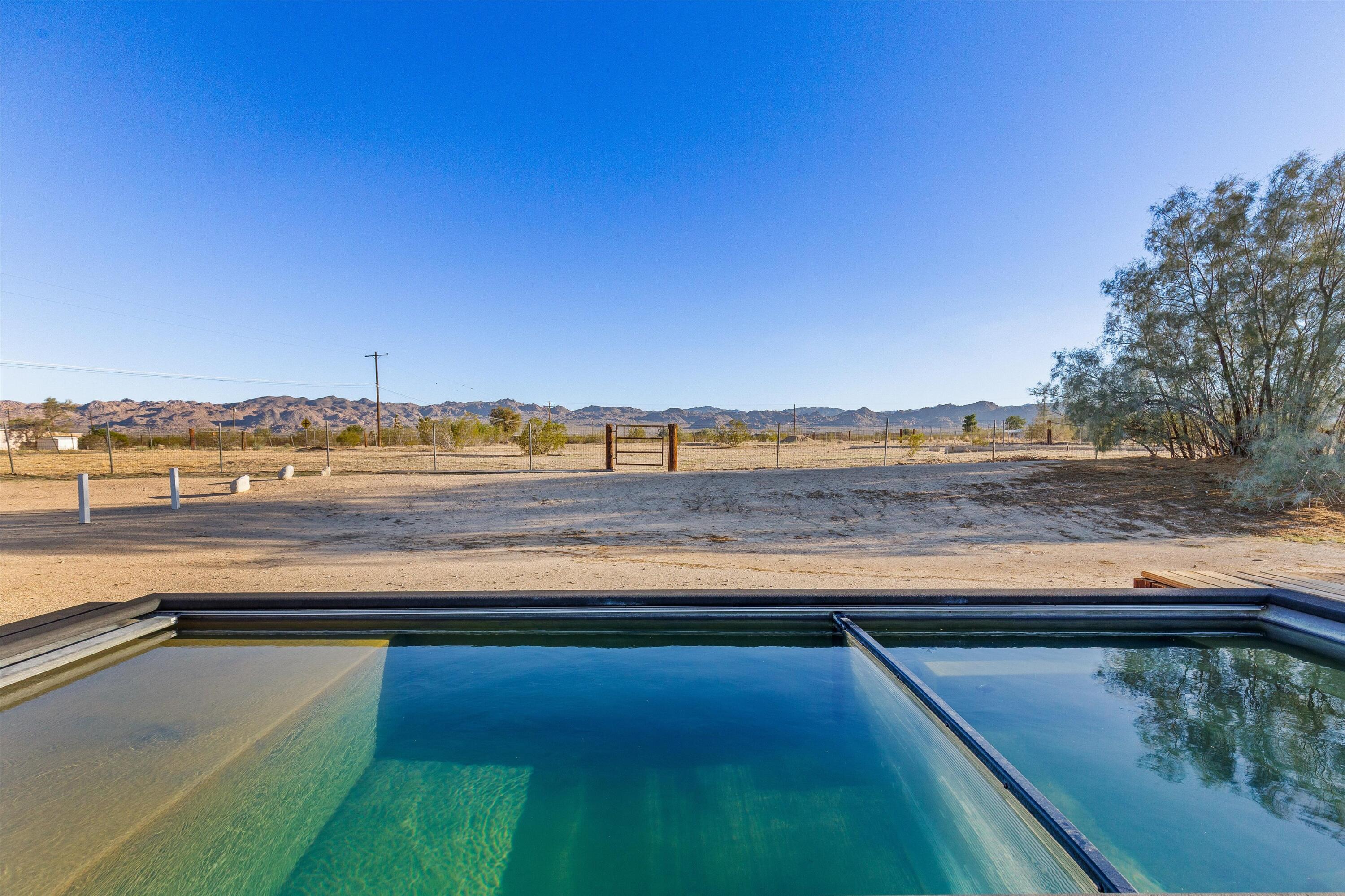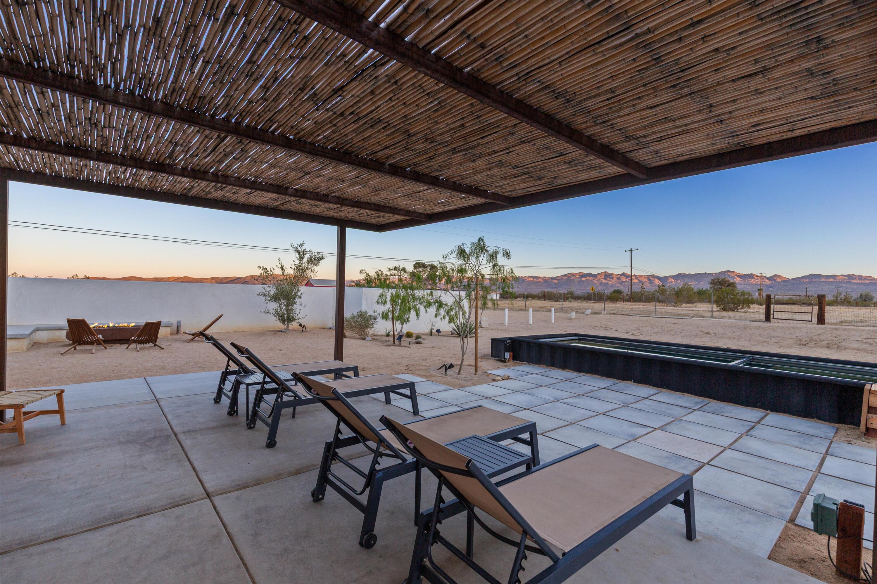 Nestled on a pristine 3-acre parcel in the heart of Joshua Tree, 4610 Sunkist Road is a one-of-a-kind architectural retreat blending refined Mediterranean influences with modern desert minimalism. This 3-bedroom, 1-bathroom home spans 1,568 sq ft and has been meticulously reimagined with a design sensibility rarely found in the high desert. Currently utilized as a top-performing, meticulously maintained Airbnb.Design-forward details include smooth plaster walls, polished concrete floors, handcrafted tiles, and expansive folding glass doors that dissolve the boundary between indoors and out. A luminous open kitchen, two distinct living areas, and curated finishes throughout create a space as functional as it is striking.Step outside to a heated Modpool/spa, sculptural fire feature, shaded lounge areas, and panoramic views framed by olive trees and southern mountains. With 32 owned solar panels, EV charging, and a fully fenced footprint, this ultra-private, turnkey haven is just 8 minutes from the park--perfect for discerning buyers seeking a unique retreat and great investment opportunity.