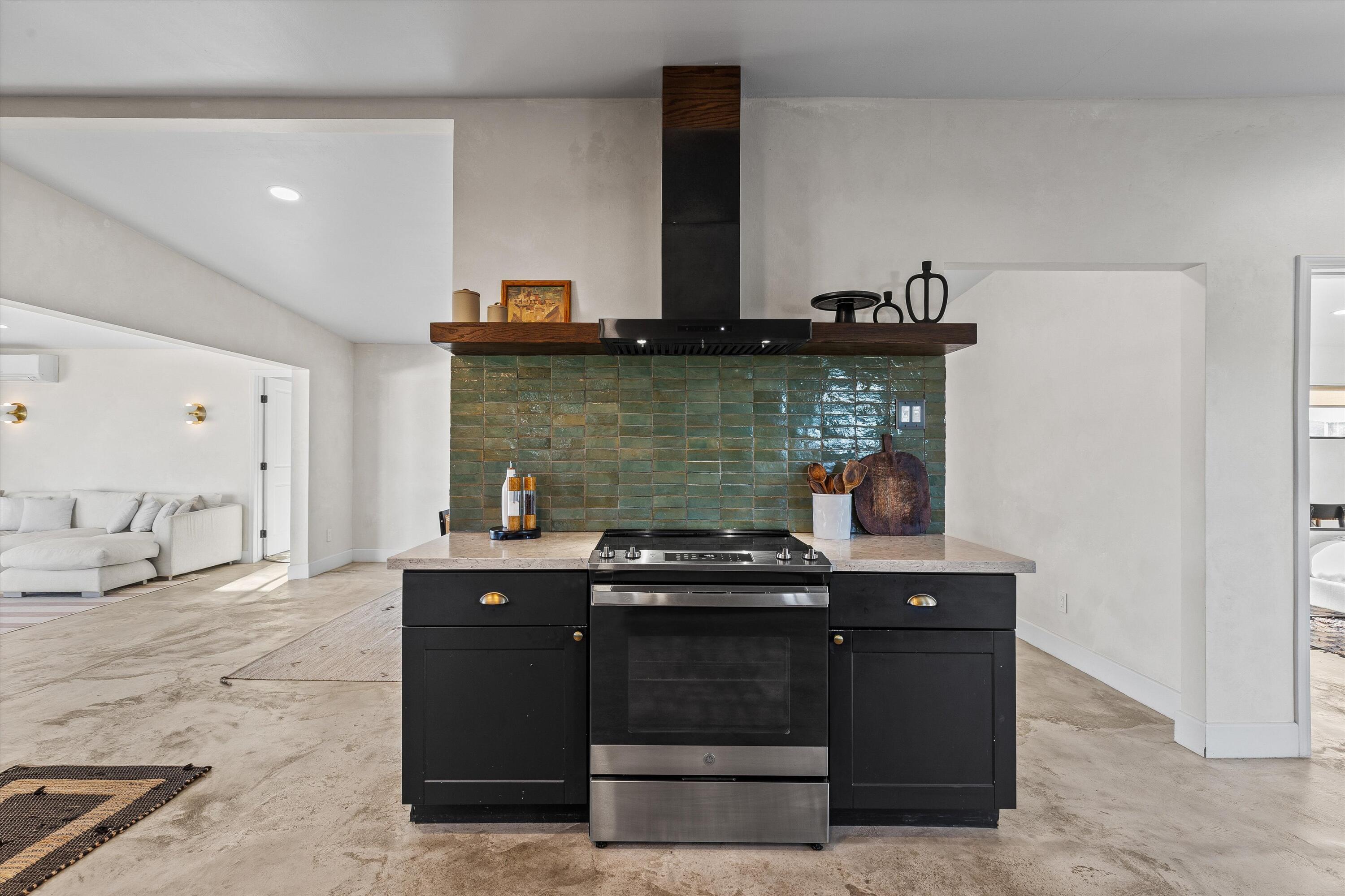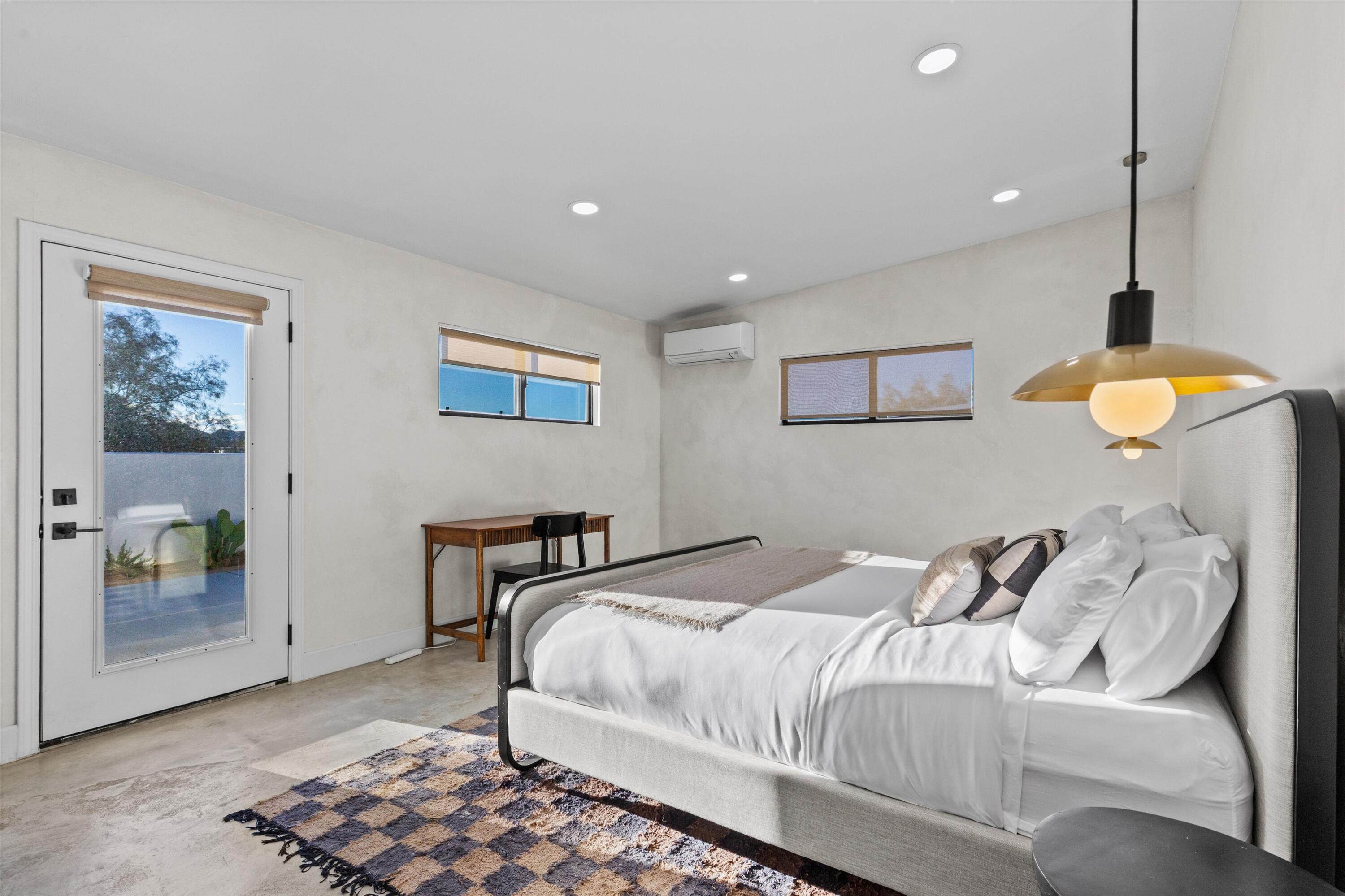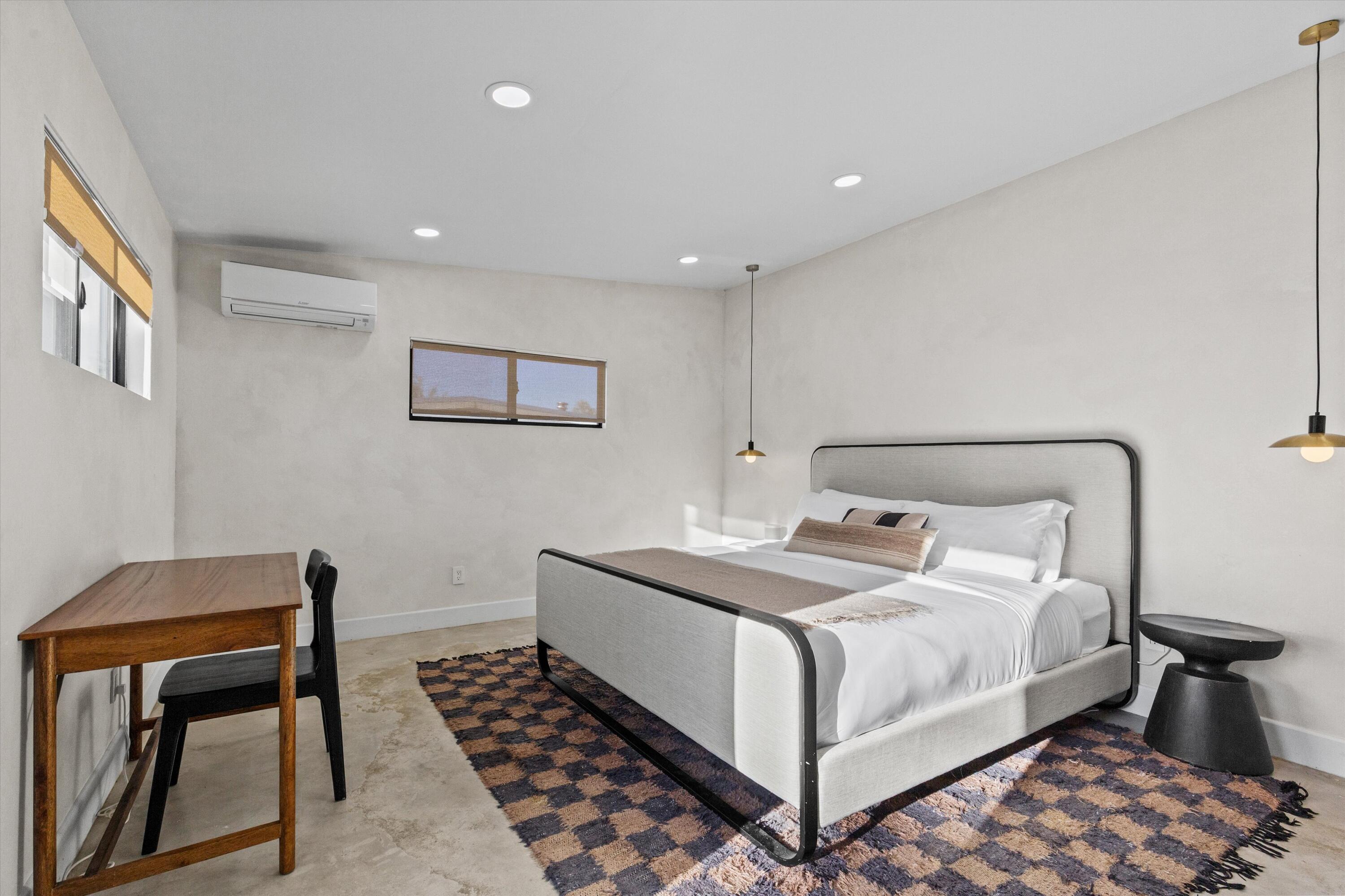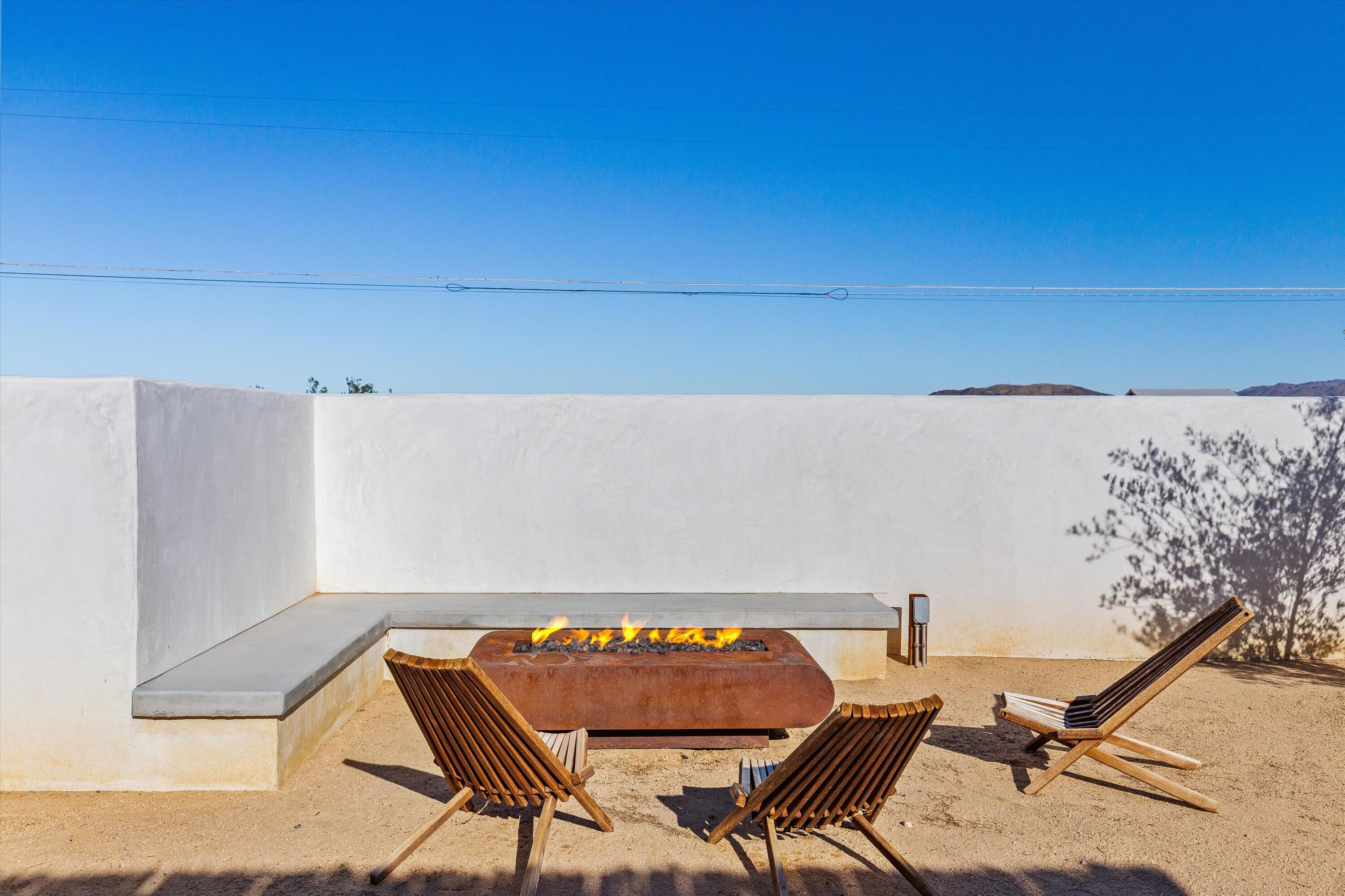 Nestled on a pristine 3-acre parcel in the heart of Joshua Tree, 4610 Sunkist Road is a one-of-a-kind architectural retreat blending refined Mediterranean influences with modern desert minimalism. This 3-bedroom, 1-bathroom home spans 1,568 sq ft and has been meticulously reimagined with a design sensibility rarely found in the high desert. Currently utilized as a top-performing, meticulously maintained Airbnb.Design-forward details include smooth plaster walls, polished concrete floors, handcrafted tiles, and expansive folding glass doors that dissolve the boundary between indoors and out. A luminous open kitchen, two distinct living areas, and curated finishes throughout create a space as functional as it is striking.Step outside to a heated Modpool/spa, sculptural fire feature, shaded lounge areas, and panoramic views framed by olive trees and southern mountains. With 32 owned solar panels, EV charging, and a fully fenced footprint, this ultra-private, turnkey haven is just 8 minutes from the park--perfect for discerning buyers seeking a unique retreat and great investment opportunity.