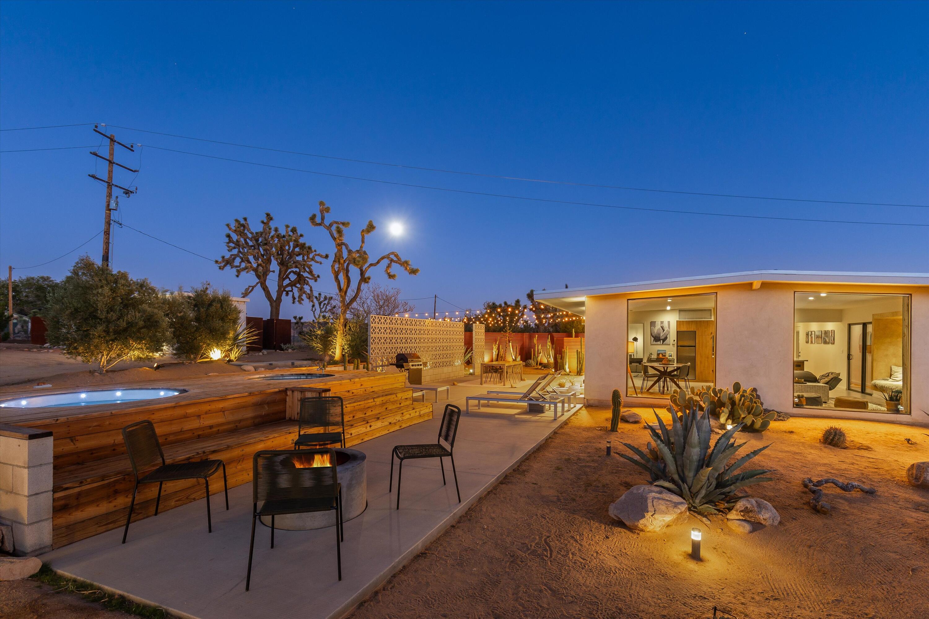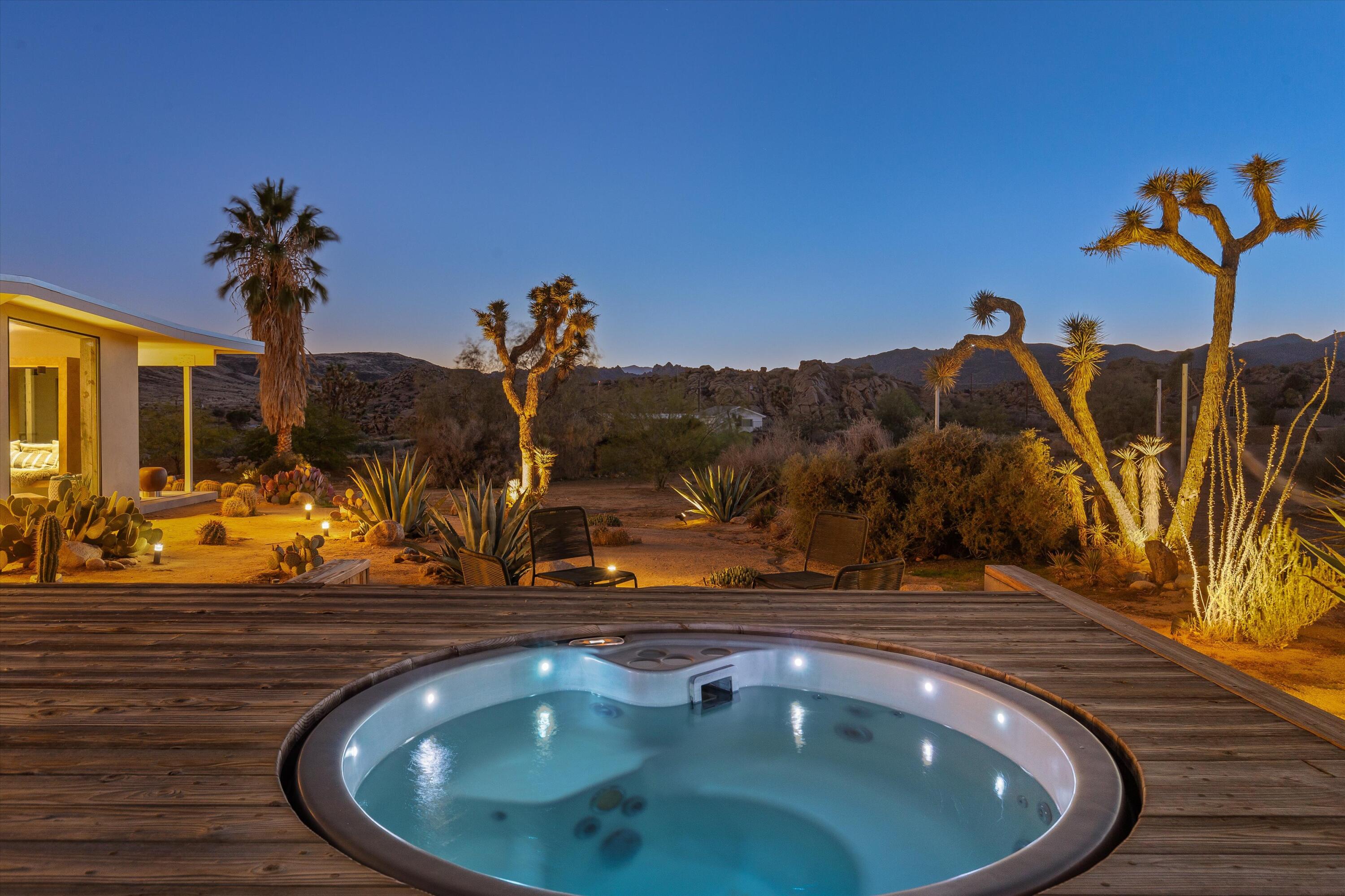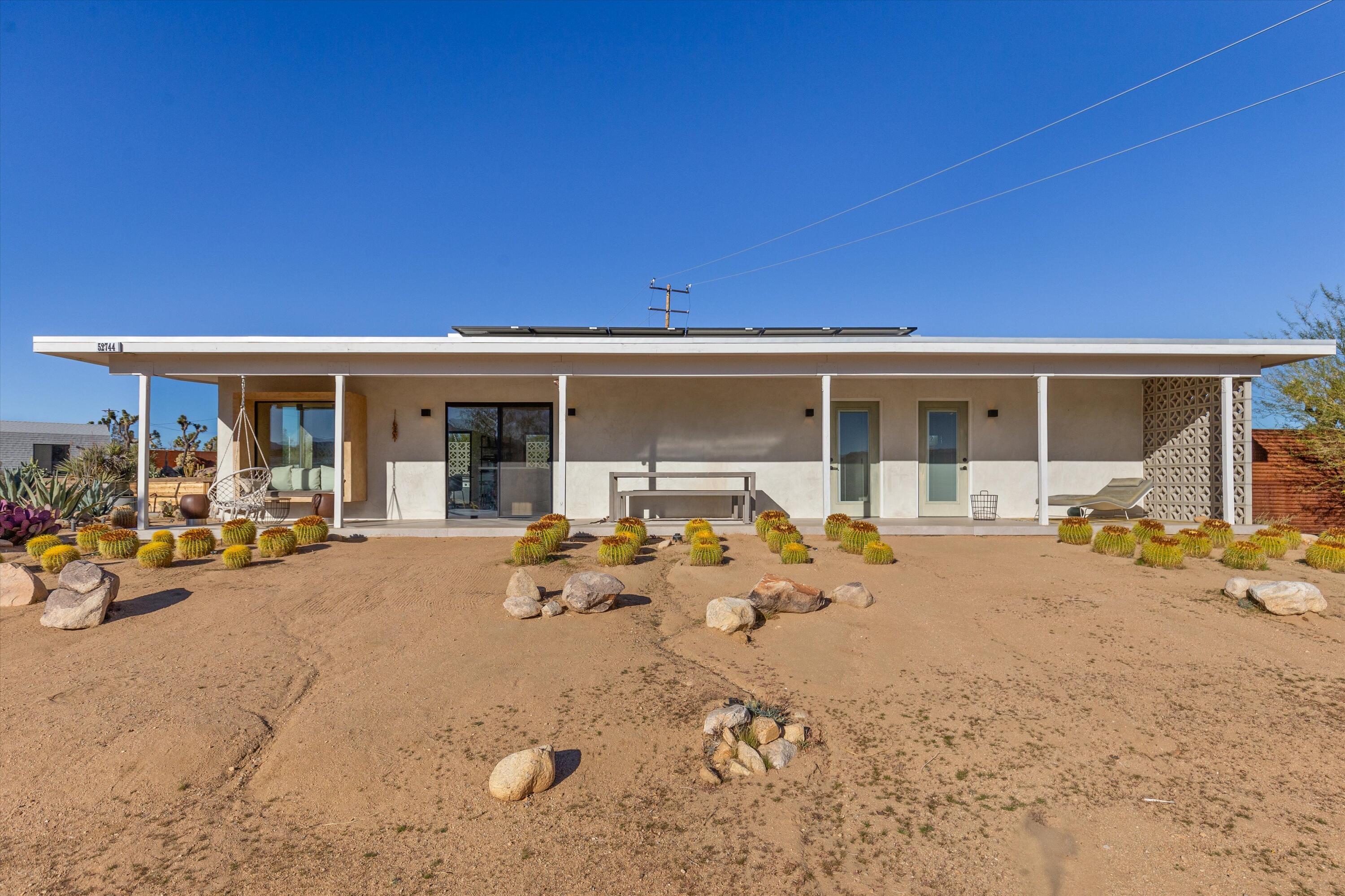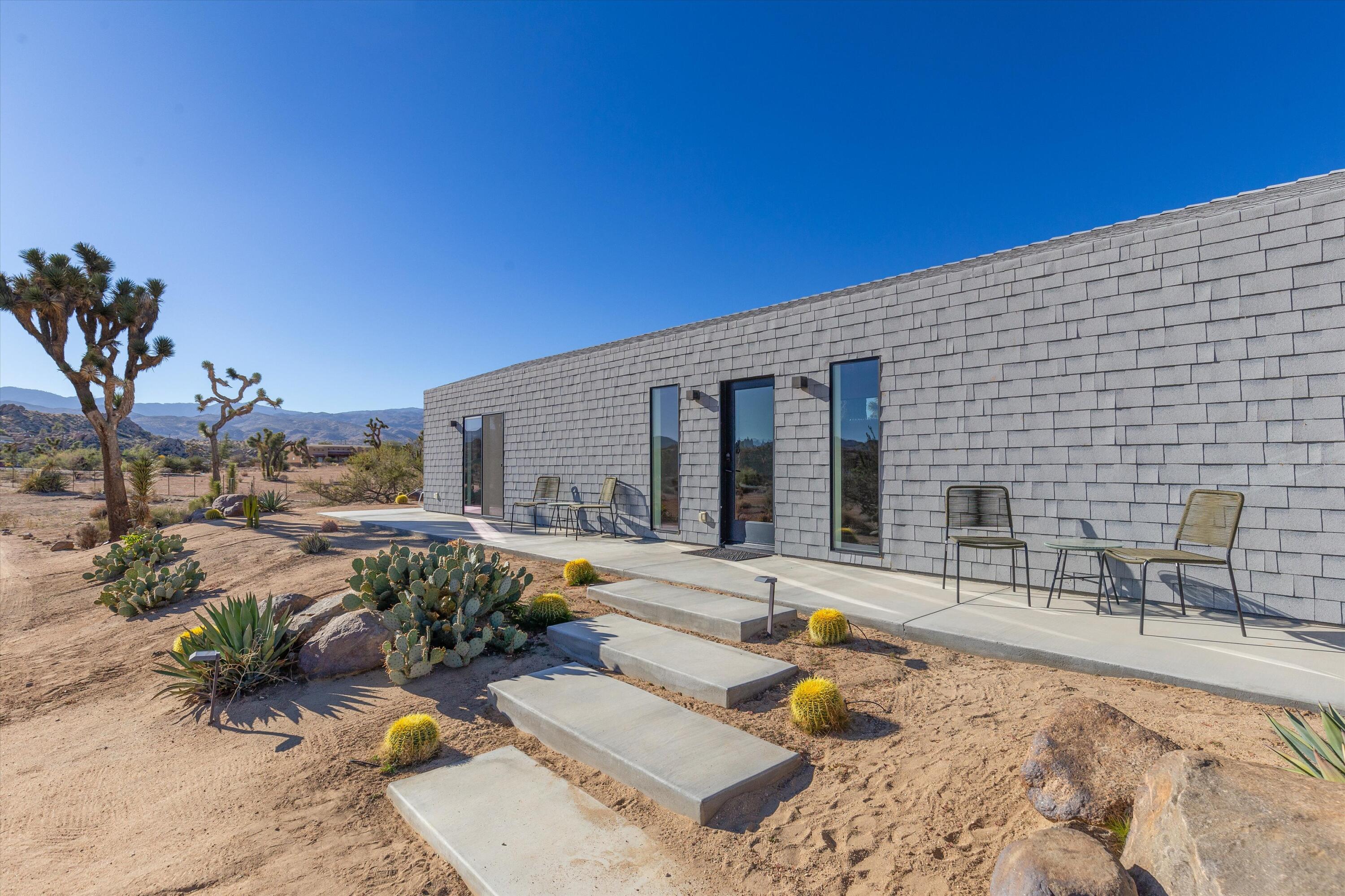 A contemporary Pipes Canyon compound by Wolfgang Pichler where architecture, landscape and light come together. Set on a private rise with long, open views, the property looks out toward the Sawtooth Mountains, distant boulder fields and wide mesa lines. The setting feels quiet and expansive, with intentional desert landscaping, specimen trees and mature plantings that frame the homes and create a sense of privacy. The main house, renovated in 2019, is designed for true indoor-outdoor living, with floor-to-ceiling glass, a clean open layout and a modern kitchen anchored by a large island. The primary suite continues the indoor-outdoor flow with a spa-like bath that includes a soaking tub, a walk-in shower and access to a private outdoor area with an outdoor shower. The second bedroom features its own en-suite bath and a private outdoor connection. The ADU, built in 2022, follows the same architectural language, offering large picture windows, beautiful natural light and far-reaching views. It includes two bedrooms with en-suite baths, a well-designed kitchen and a comfortable living area. Outdoor spaces are designed for easy gathering and relaxation, with an elevated deck, cowboy pool, spa, two outdoor soaking tubs, a fire feature, an open-air dining area and a collection of thoughtfully placed seating areas throughout the property, each oriented toward different views and moments in the landscape. With privacy, striking landscapes and thoughtful architecture, this property works as a full-time home, private retreat or high-performing short-term rental. It already enjoys strong rental income with significant opportunity to grow even further. Minutes to Pioneertown, Pappy and Harriets and Red Dog Saloon, and close to the trails of the Pioneertown Mountains Preserve and the Sand to Snow National Monument. Also an easy drive to La Copine, The Integratron, downtown Joshua Tree and Joshua Tree National Park, all while feeling quiet, private and immersed in one of the mos