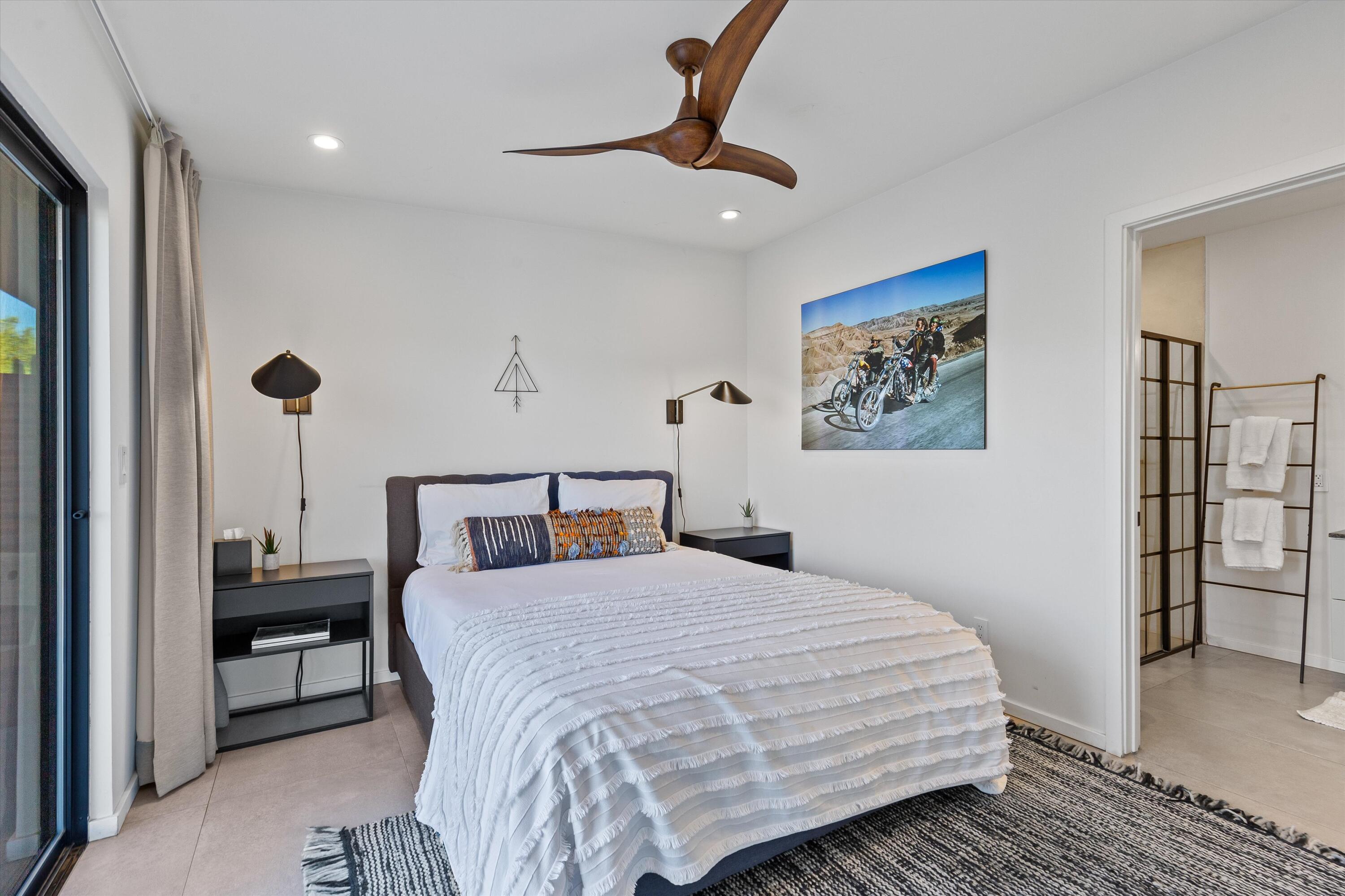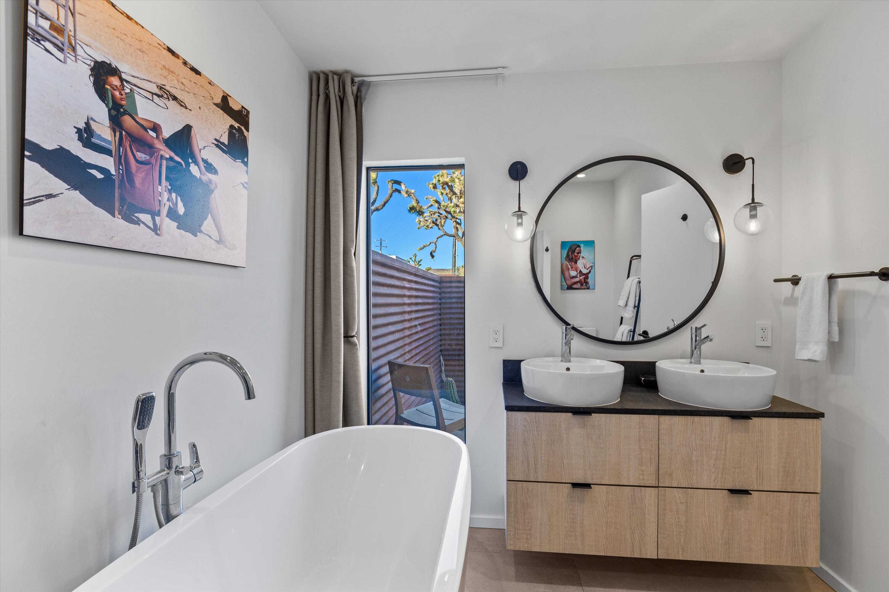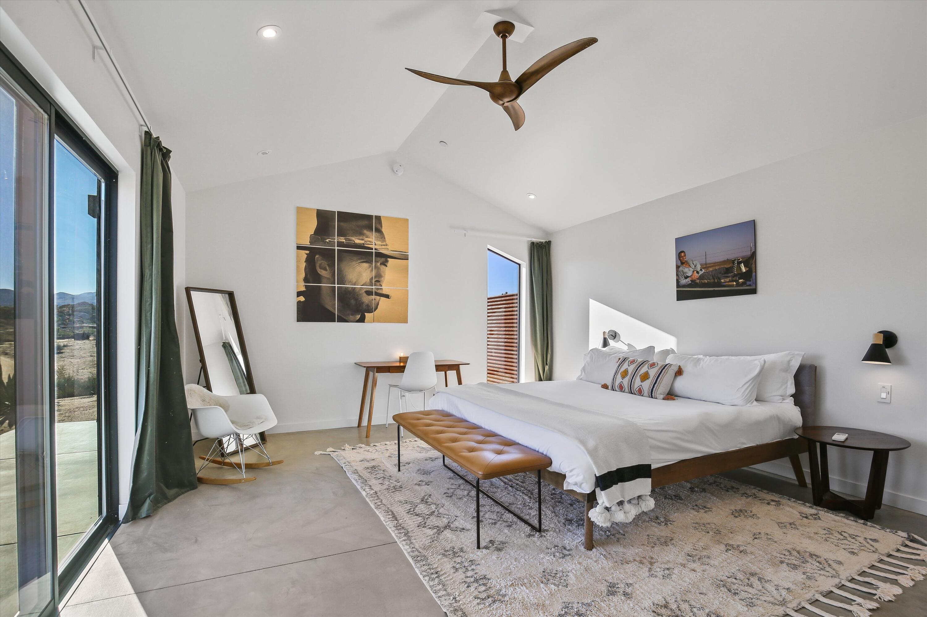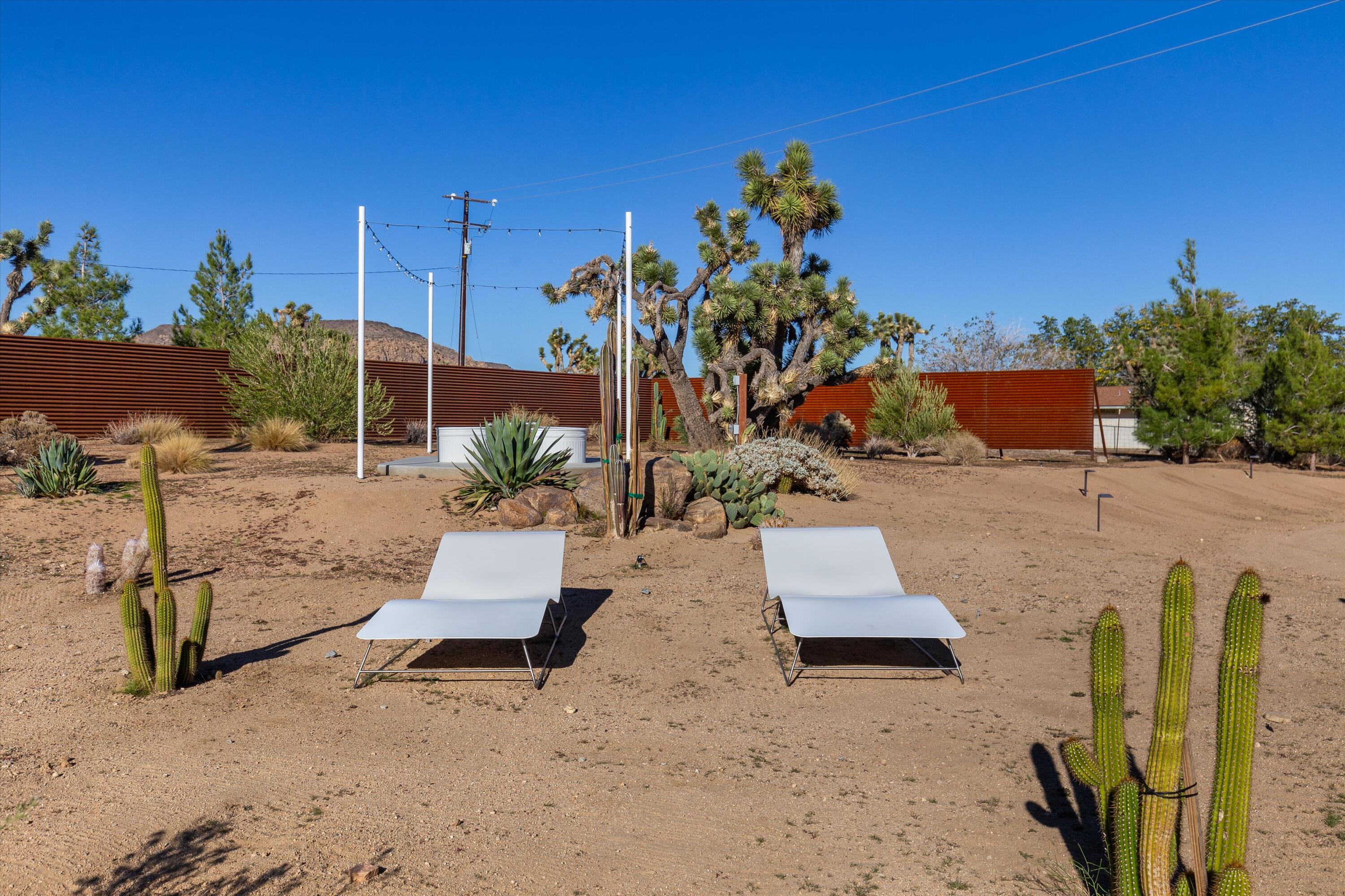 A contemporary Pipes Canyon compound by Wolfgang Pichler where architecture, landscape and light come together. Set on a private rise with long, open views, the property looks out toward the Sawtooth Mountains, distant boulder fields and wide mesa lines. The setting feels quiet and expansive, with intentional desert landscaping, specimen trees and mature plantings that frame the homes and create a sense of privacy. The main house, renovated in 2019, is designed for true indoor-outdoor living, with floor-to-ceiling glass, a clean open layout and a modern kitchen anchored by a large island. The primary suite continues the indoor-outdoor flow with a spa-like bath that includes a soaking tub, a walk-in shower and access to a private outdoor area with an outdoor shower. The second bedroom features its own en-suite bath and a private outdoor connection. The ADU, built in 2022, follows the same architectural language, offering large picture windows, beautiful natural light and far-reaching views. It includes two bedrooms with en-suite baths, a well-designed kitchen and a comfortable living area. Outdoor spaces are designed for easy gathering and relaxation, with an elevated deck, cowboy pool, spa, two outdoor soaking tubs, a fire feature, an open-air dining area and a collection of thoughtfully placed seating areas throughout the property, each oriented toward different views and moments in the landscape. With privacy, striking landscapes and thoughtful architecture, this property works as a full-time home, private retreat or high-performing short-term rental. It already enjoys strong rental income with significant opportunity to grow even further. Minutes to Pioneertown, Pappy and Harriets and Red Dog Saloon, and close to the trails of the Pioneertown Mountains Preserve and the Sand to Snow National Monument. Also an easy drive to La Copine, The Integratron, downtown Joshua Tree and Joshua Tree National Park, all while feeling quiet, private and immersed in one of the mos