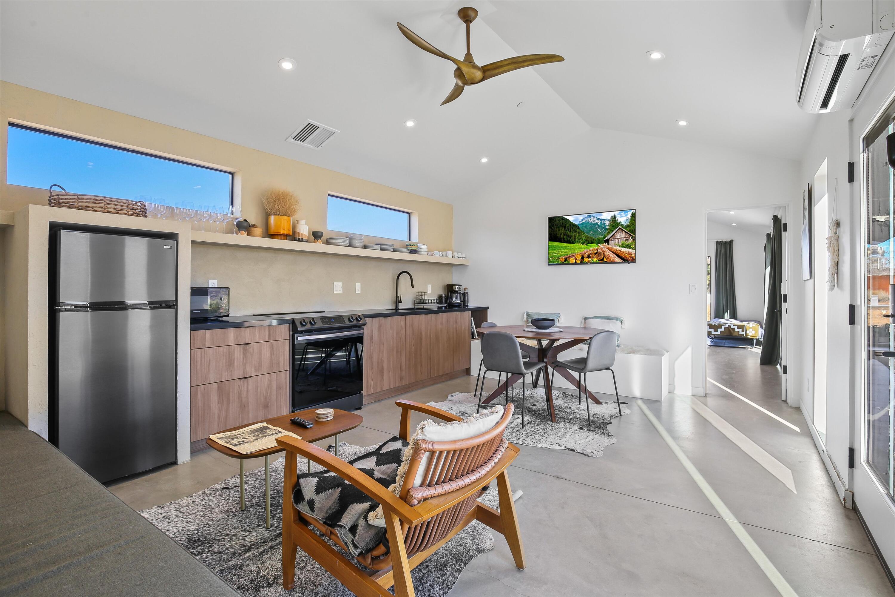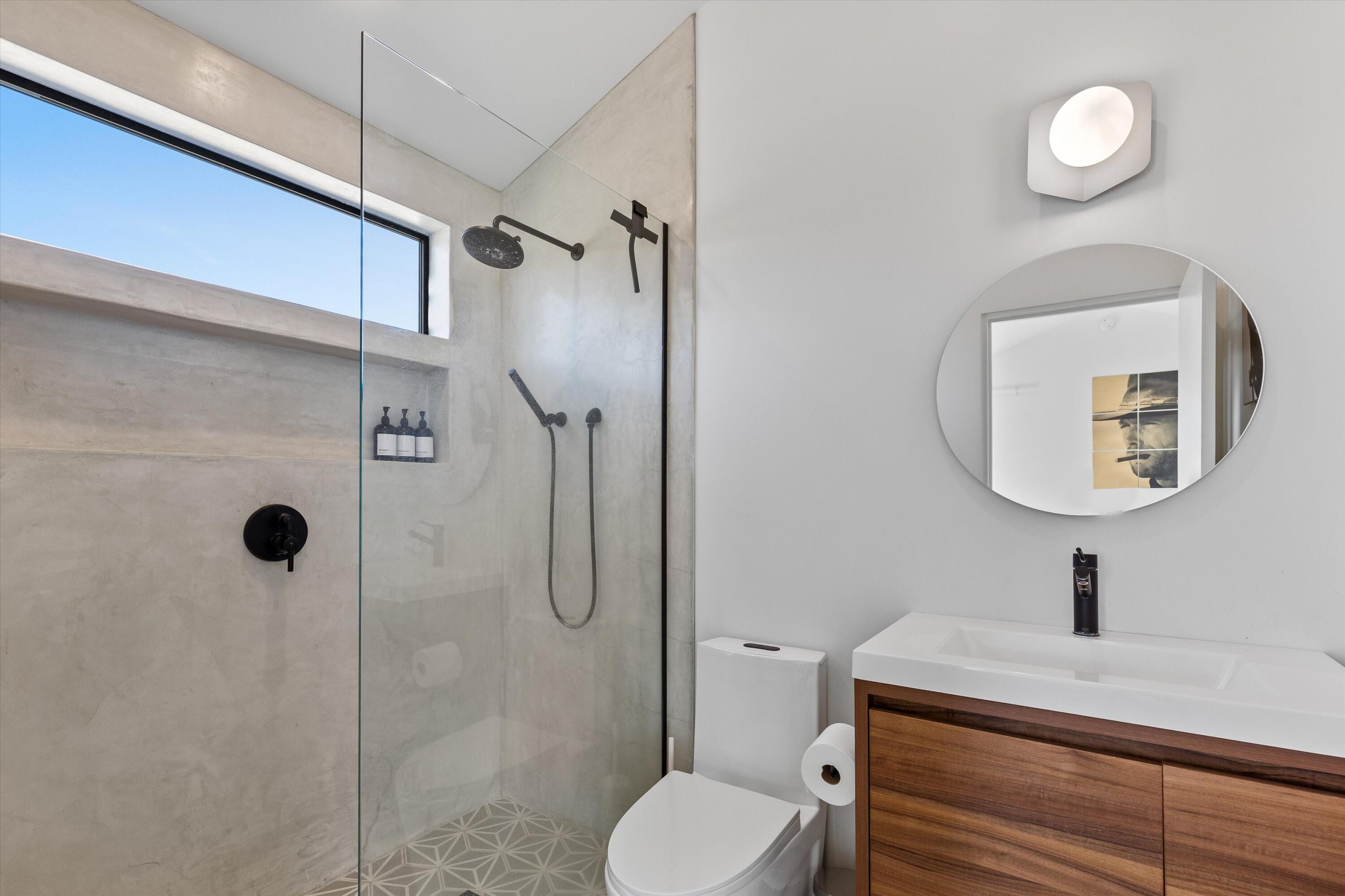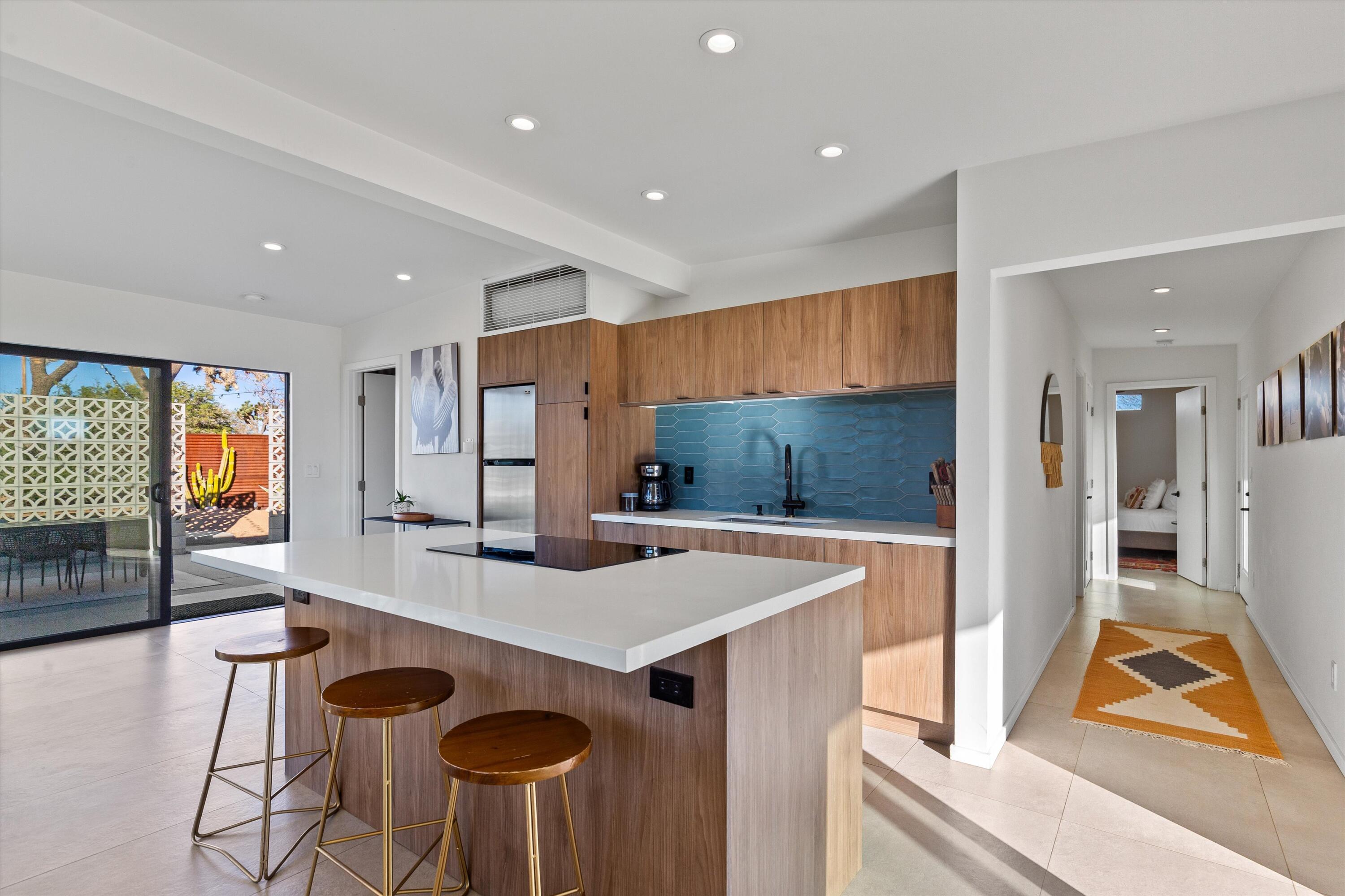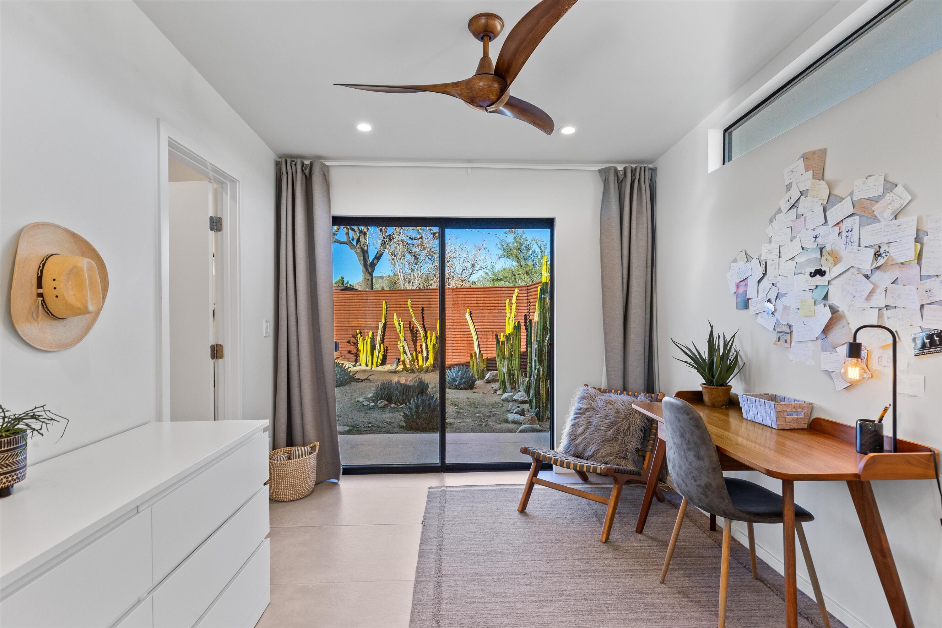 A contemporary Pipes Canyon compound by Wolfgang Pichler where architecture, landscape and light come together. Set on a private rise with long, open views, the property looks out toward the Sawtooth Mountains, distant boulder fields and wide mesa lines. The setting feels quiet and expansive, with intentional desert landscaping, specimen trees and mature plantings that frame the homes and create a sense of privacy. The main house, renovated in 2019, is designed for true indoor-outdoor living, with floor-to-ceiling glass, a clean open layout and a modern kitchen anchored by a large island. The primary suite continues the indoor-outdoor flow with a spa-like bath that includes a soaking tub, a walk-in shower and access to a private outdoor area with an outdoor shower. The second bedroom features its own en-suite bath and a private outdoor connection. The ADU, built in 2022, follows the same architectural language, offering large picture windows, beautiful natural light and far-reaching views. It includes two bedrooms with en-suite baths, a well-designed kitchen and a comfortable living area. Outdoor spaces are designed for easy gathering and relaxation, with an elevated deck, cowboy pool, spa, two outdoor soaking tubs, a fire feature, an open-air dining area and a collection of thoughtfully placed seating areas throughout the property, each oriented toward different views and moments in the landscape. With privacy, striking landscapes and thoughtful architecture, this property works as a full-time home, private retreat or high-performing short-term rental. It already enjoys strong rental income with significant opportunity to grow even further. Minutes to Pioneertown, Pappy and Harriets and Red Dog Saloon, and close to the trails of the Pioneertown Mountains Preserve and the Sand to Snow National Monument. Also an easy drive to La Copine, The Integratron, downtown Joshua Tree and Joshua Tree National Park, all while feeling quiet, private and immersed in one of the mos
