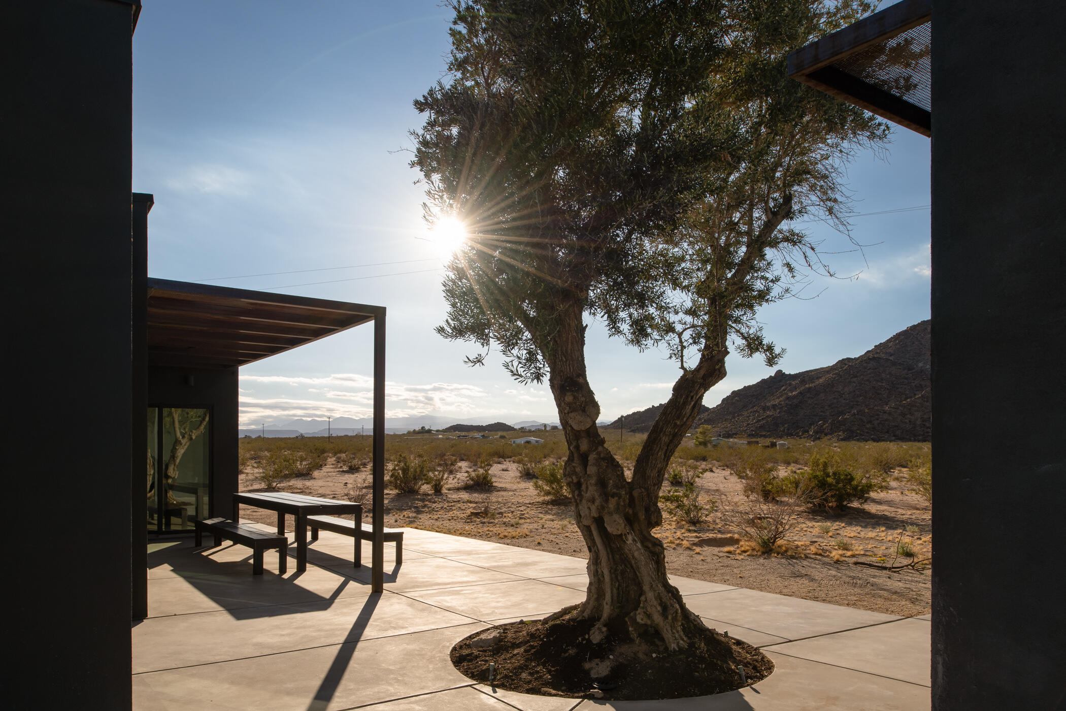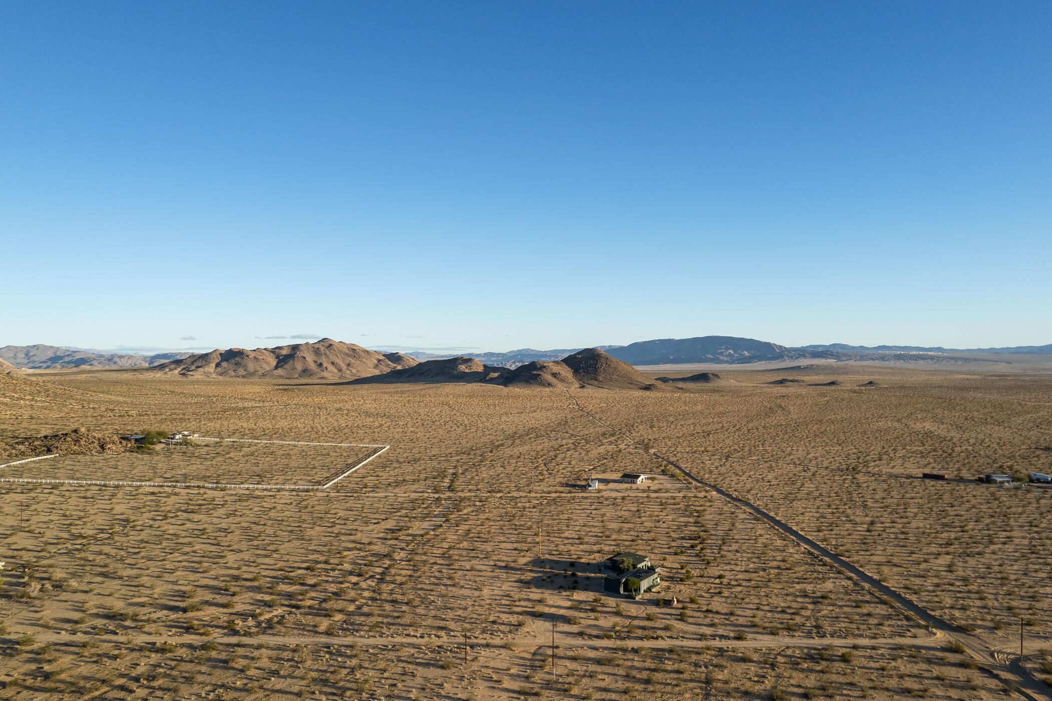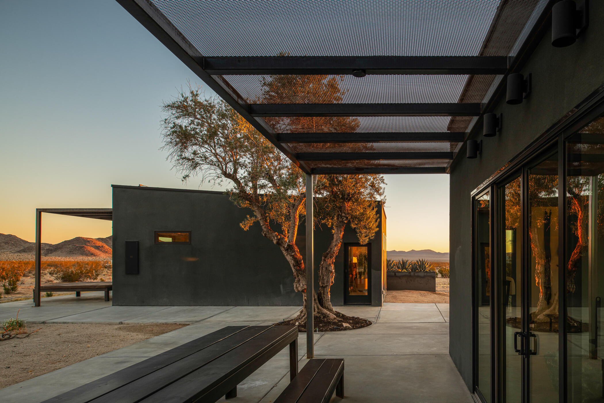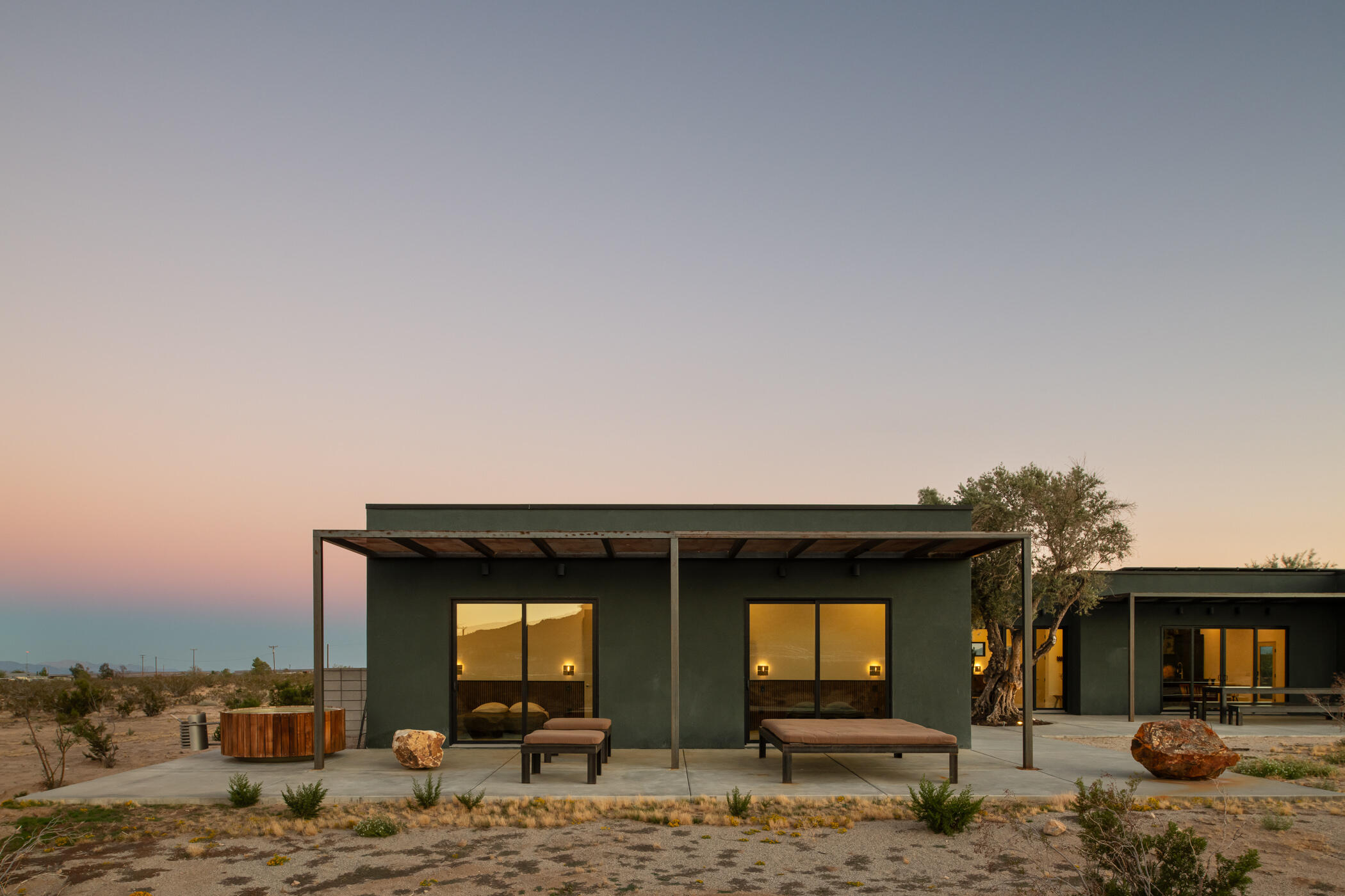 The Goat Mountain HouseA 2024 architectural desert compound set against the raw beauty of the Mojave.Welcome to The Goat Mountain House, a contemporary, design-forward retreat conceived for those who value architecture as art. Completed in 2024, this modern minimalist compound comprises two sculptural volumes: a striking main residence and a generous guest house, each thoughtfully positioned to harmonize with the surrounding landscape and capture the quiet grandeur of Goat Mountain.The main house features clean lines, smooth stucco walls, and soaring ceilings that create a sense of calm and openness. Floor-to-ceiling glass frames expansive High Desert views, flooding the interior with natural light and connecting every space to the rugged beauty outside. A refined kitchen with a large island anchors the open-concept layout, flanked by two serene bedrooms and a spa-like bath.A west-facing covered patio extends the living area outdoors, ideal for al fresco dining beneath endless desert skies. Between the two structures, a mature olive tree offers a sculptural focal point and anchors the flow of the compound.The guest house mirrors the home's aesthetic with its own living area, kitchenette, two bedrooms, and a beautifully finished bath. Outside, a wood-paneled hot tub and private patio create a perfect vantage point for stargazing or quiet morning coffee.Set in one of the most desirable pockets of the desert, the property offers rare tranquility, sweeping panoramic views, and a feeling of total serenity, all just minutes from Joshua Tree National Park, La Copine, the Integratron, and the shops and dining of Pioneertown and Yucca Valley.Custom planter boxes with sculptural cacti and a bespoke stone fire feature complete the setting, an intentional blend of restraint and warmth.More than a home, The Goat Mountain House is a living composition, an architectural retreat that functions beautifully as a full-time residence, a second home, or a design-forward short-term renta
