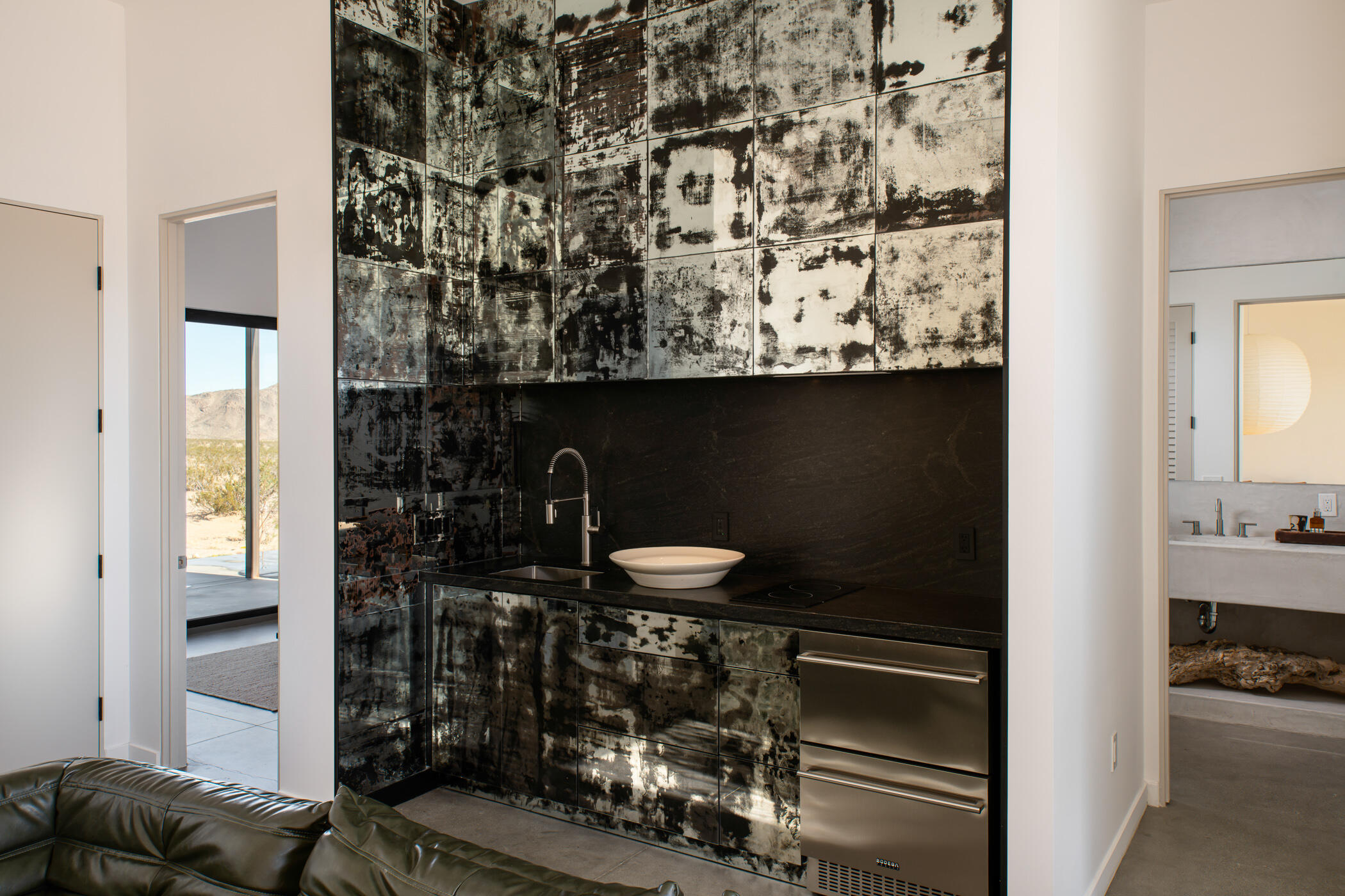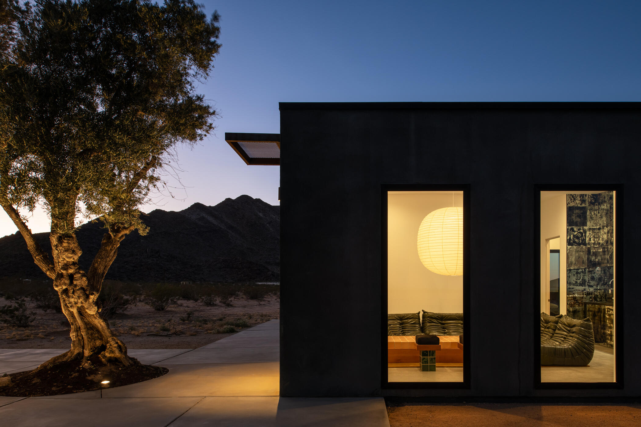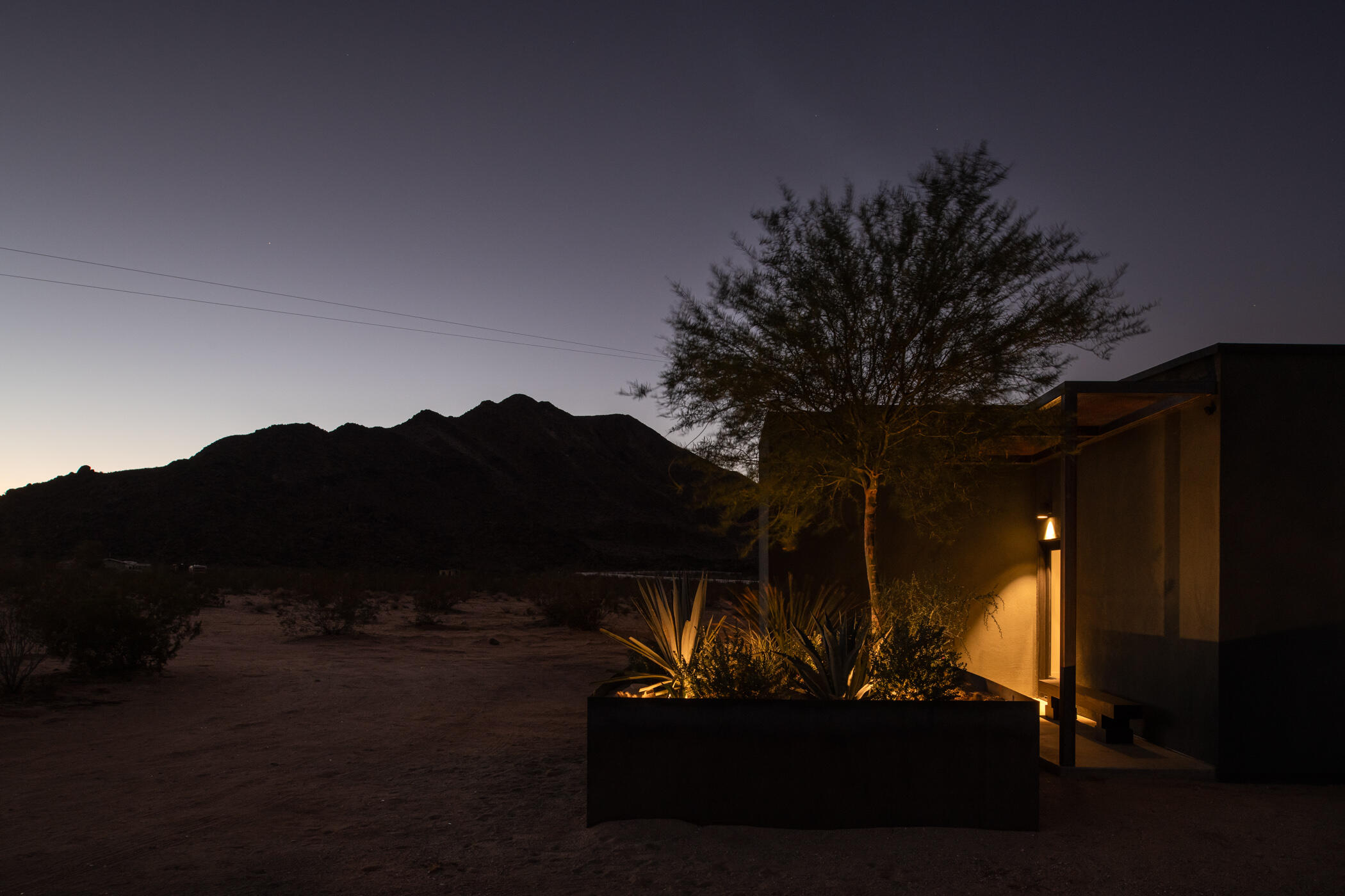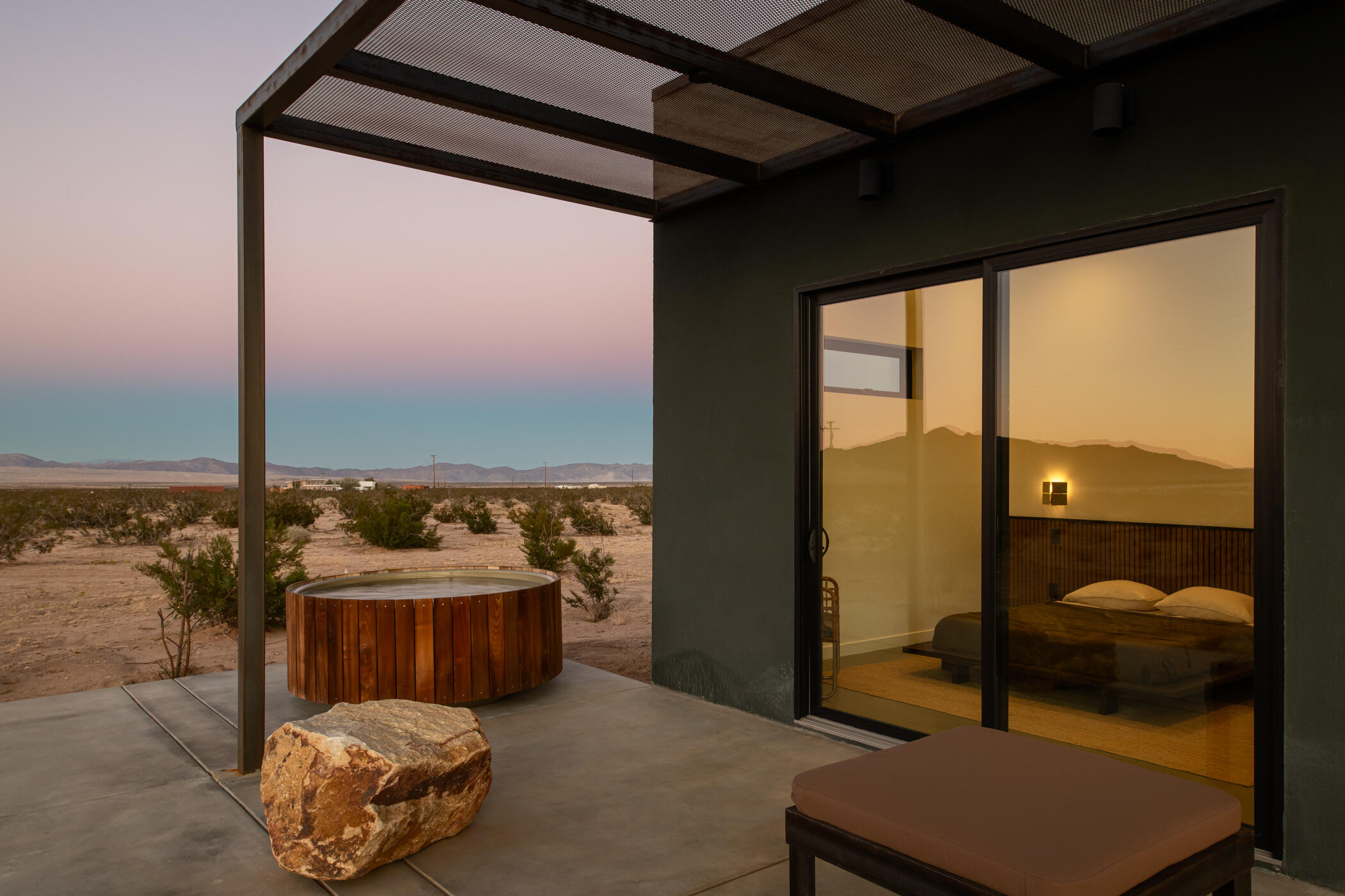 The Goat Mountain HouseA 2024 architectural desert compound set against the raw beauty of the Mojave.Welcome to The Goat Mountain House, a contemporary, design-forward retreat conceived for those who value architecture as art. Completed in 2024, this modern minimalist compound comprises two sculptural volumes: a striking main residence and a generous guest house, each thoughtfully positioned to harmonize with the surrounding landscape and capture the quiet grandeur of Goat Mountain.The main house features clean lines, smooth stucco walls, and soaring ceilings that create a sense of calm and openness. Floor-to-ceiling glass frames expansive High Desert views, flooding the interior with natural light and connecting every space to the rugged beauty outside. A refined kitchen with a large island anchors the open-concept layout, flanked by two serene bedrooms and a spa-like bath.A west-facing covered patio extends the living area outdoors, ideal for al fresco dining beneath endless desert skies. Between the two structures, a mature olive tree offers a sculptural focal point and anchors the flow of the compound.The guest house mirrors the home's aesthetic with its own living area, kitchenette, two bedrooms, and a beautifully finished bath. Outside, a wood-paneled hot tub and private patio create a perfect vantage point for stargazing or quiet morning coffee.Set in one of the most desirable pockets of the desert, the property offers rare tranquility, sweeping panoramic views, and a feeling of total serenity, all just minutes from Joshua Tree National Park, La Copine, the Integratron, and the shops and dining of Pioneertown and Yucca Valley.Custom planter boxes with sculptural cacti and a bespoke stone fire feature complete the setting, an intentional blend of restraint and warmth.More than a home, The Goat Mountain House is a living composition, an architectural retreat that functions beautifully as a full-time residence, a second home, or a design-forward short-term renta