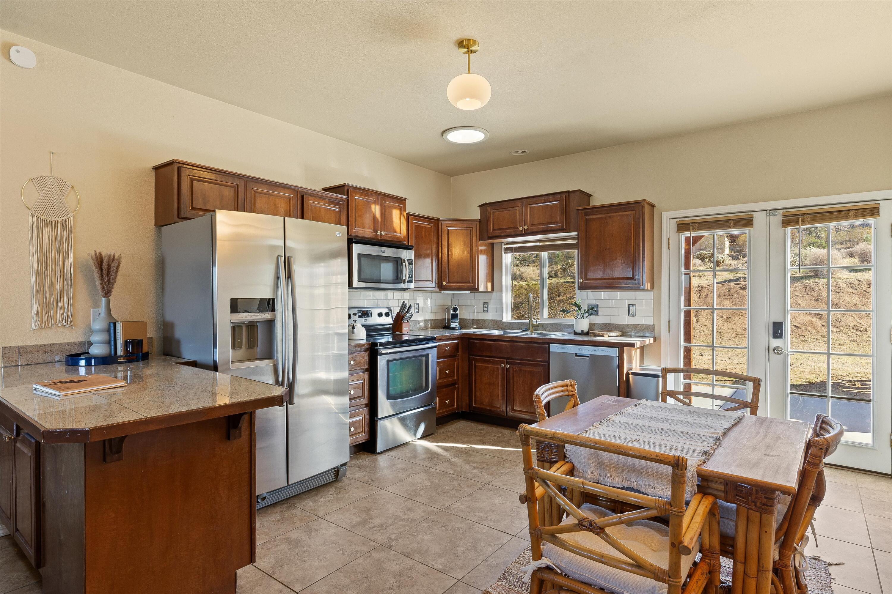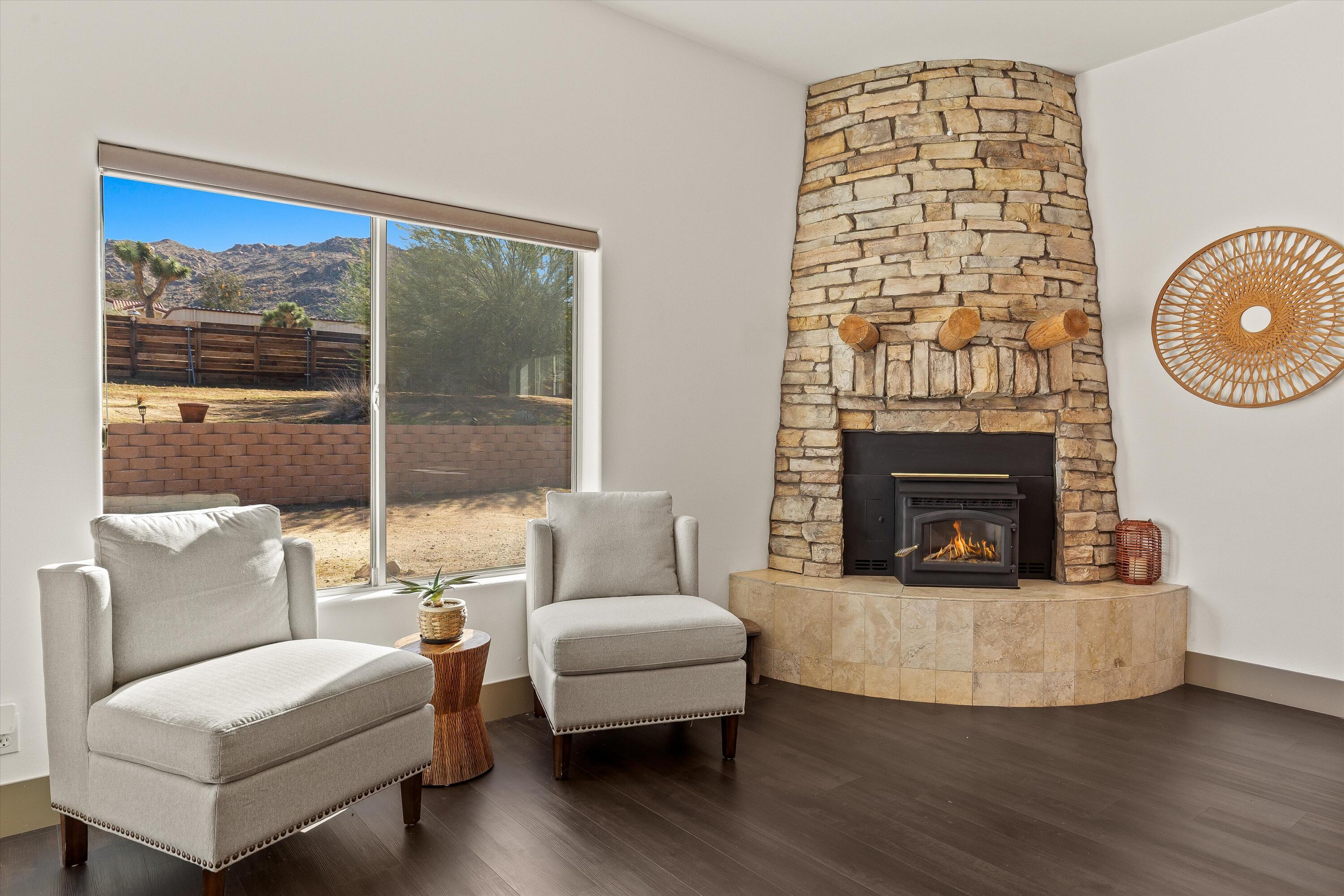 Rare opportunity in South Joshua Tree: Two homes, totaling 5 beds and 4 baths, on one 2.3-acre lot in a great location. With so many potential future uses for a new owner, this property offers double income potential, or the flexibility to live in one home while renting the other, or keep both for family and your guests. When the property was utilized as a full time rental, it grossed $150k (2024). Zoned Residential 2, these are two separate full residences, not just a main home with a guest house - making this a truly unique opportunity. House A is a custom Santa Fe-style build with 3 bedrooms + den, 2 bathrooms, and a spacious open. Enter the home via the large, private front deck and enter to find 10' ceilings, an updated kitchen, large great room, and an expansive primary suite, complete with a stone pellet stove, walk-in closet, and en-suite bath with jetted tub and separate shower. The home also has an individual laundry room and garage (which is currently used as a game room). The expansive yard features an elevated deck with cowboy tub, jacuzzi, and plenty of space for entertaining and stargazing. House B offers 2 bedrooms and 2 bathrooms, full kitchen with stainless appliances, its own laundry, and another attached garage (also currently set up as a game room). Outside you'll find another jacuzzi and plenty of space to enjoy. Other highlights include: OWNED solar on the main house, outdoor fire pit and sweeping valley and mountain views.