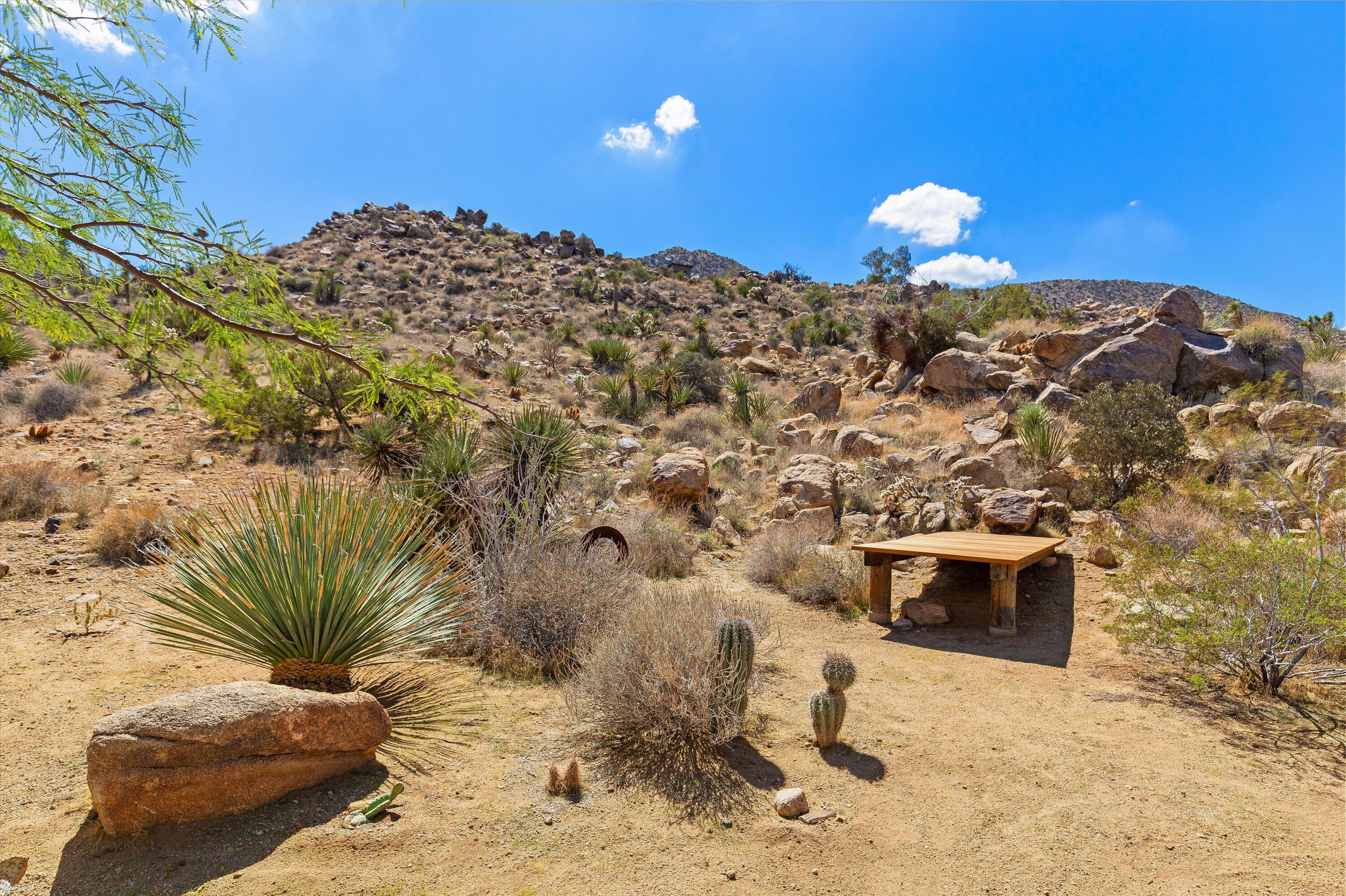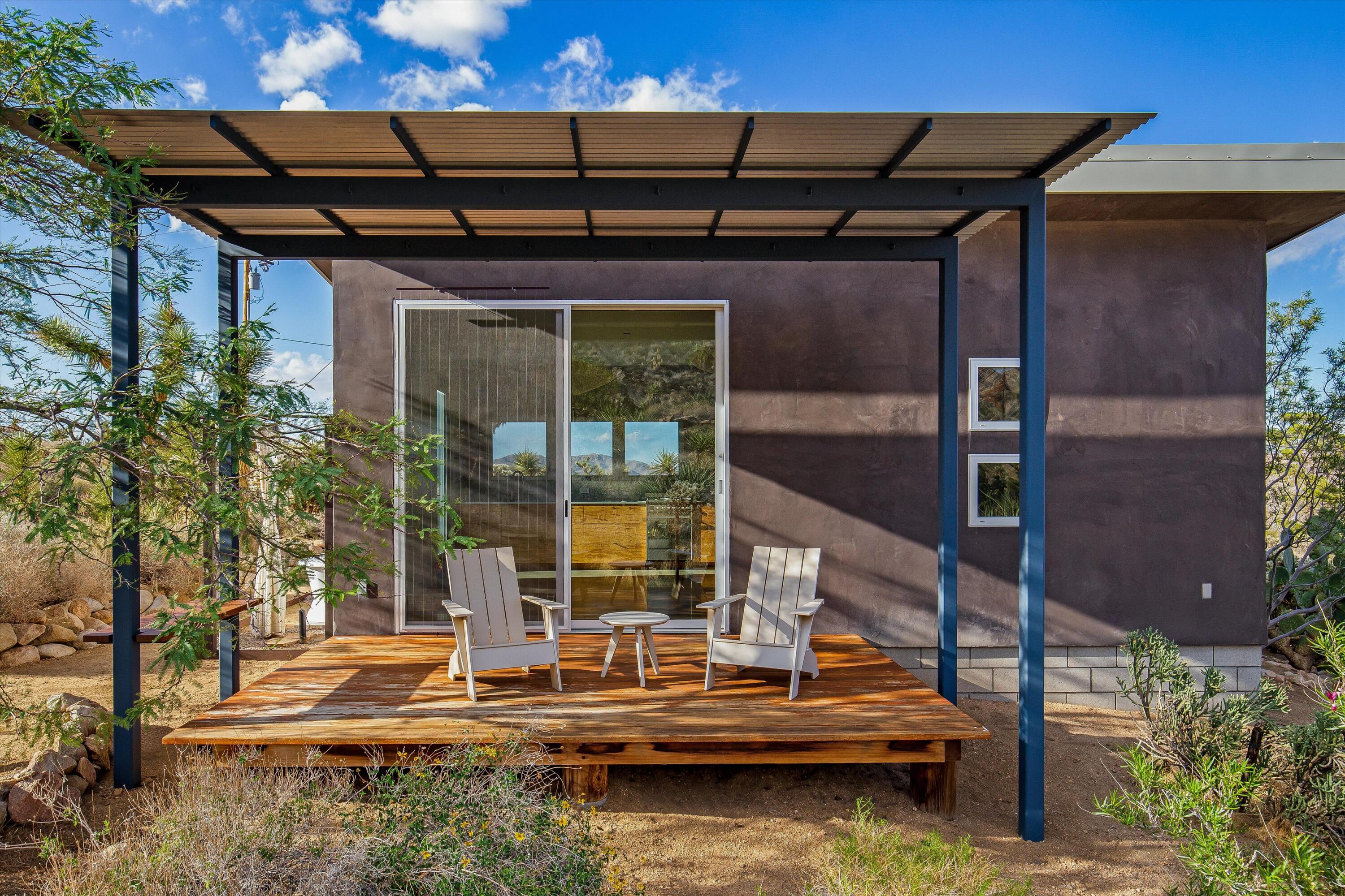 Nestled in the prestigious neighborhood of Joshua Tree Highlands, a unique opportunity to own a 2+ acre compound boasting two modern homes awaits. The main home was built in 2010, and the guest house followed shortly after in 2014, both by famed local builder David Eckenroth. Peace and tranquility, just minutes from the National Park's west entrance gate. The main house is a blank canvas ready to be transformed into your dream retreat. With an open-concept layout, sleek concrete floors, lofty ceilings, and outdoor shower, the space awaits your design direction and showcases panoramic views in every direction. The guest home offers privacy and versatility, with its own deck showcasing awe-inspiring views and outdoor bathing under the stars. Inside, custom cabinetry and polished concrete floors echo the main house's contemporary footprint. This space serves as an ideal guest suite, art studio, or office, just waiting for the finishing touches to be added. Immerse yourself in the quiet and serene ambiance of Joshua Tree, with expert planting of intentional and curated desert vegetation, iconic desert topography including boulders and Joshua trees. This compound is a true escape, offering endless potential for investors, artists, or anyone seeking a modern sanctuary in the desert.